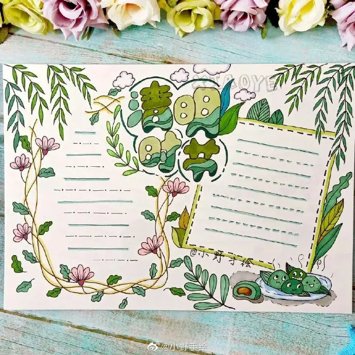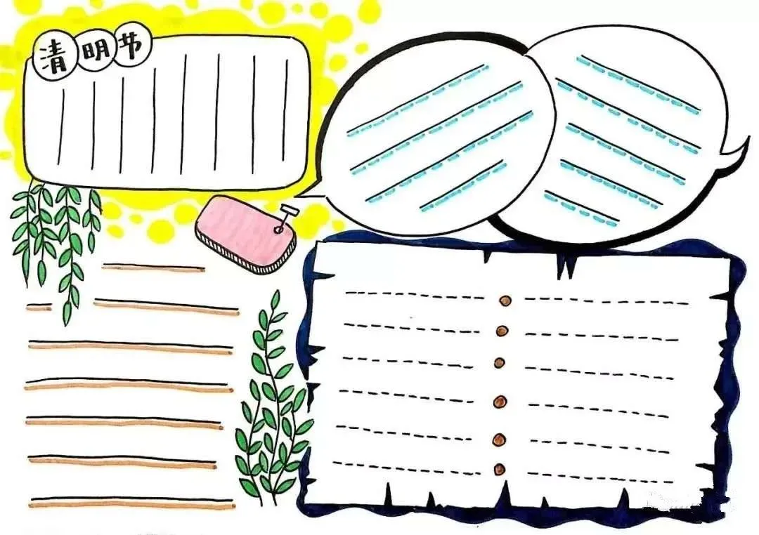 这里泛指各种边框、花边、分隔线及起到点缀作用的小图案。通常一份好看的手抄报,往往少不了这些装饰。一般在文字内容末尾空白处、段与段之间,手绘上装饰性图画,多以花草或几何形图案为主。