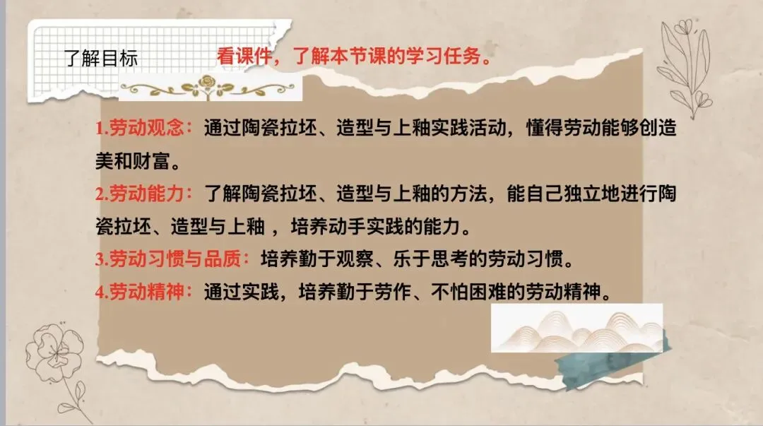 1.劳动观念:通过陶瓷拉坯、造型与上釉实践活动,懂得劳动能够创造美和财富。