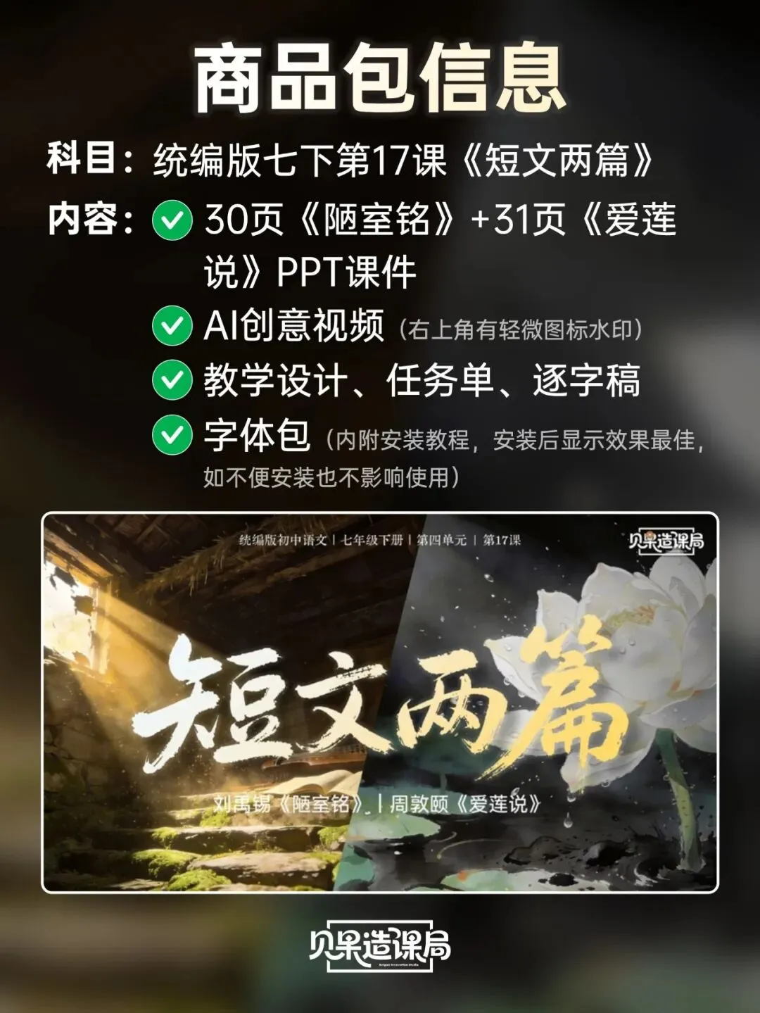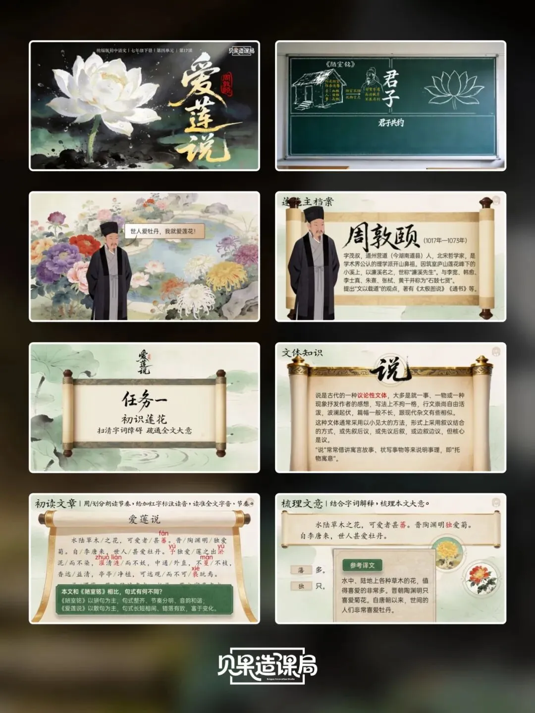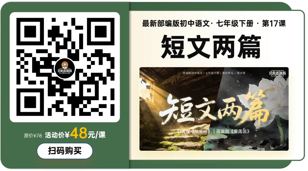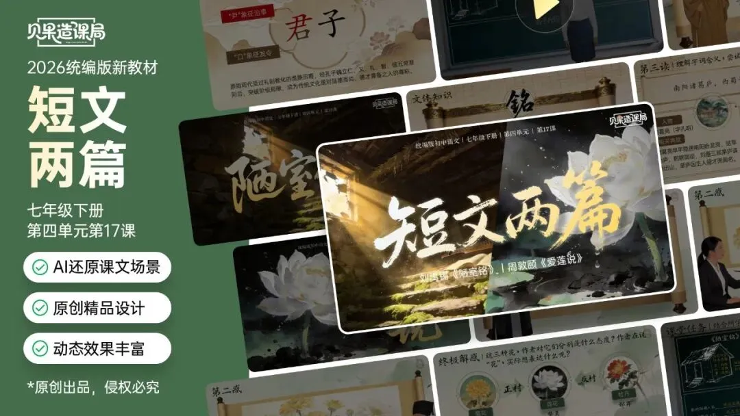 大家好~欢迎关注「贝果造课局」,今日分享统编版·七下语文第17课|《短文两篇》——《爱莲说》精品课件。本课情境设计:以学生设计“君子”主题板报为情境贯穿,课时1聚焦《陋室铭》,通过三读课文、情境开杠等环节理解刘禹锡安贫乐道的君子品格,完成板报《陋室铭》部分设计;课时2学习《爱莲说》,通过朗读课文、字词学习、花界论坛等环节,掌握莲花与君子的关联;最后双文联读、提炼共性,共同制定班级“君子共约”,完成最终板报设计,实现文言积累、文本理解与品德涵养一体化。(虚拟商品一经售出无法退换,请购前查看下方课件预览是否符合需求,购买方式在文章末尾)为感谢所有一直支持我们的粉丝朋友们,所有的商品均可扫码后先领券,新老客户可领取不同券额的优惠券!(如之前购买过我们课件,但没有领取老客优惠券成功的,可联系客服核对订单改价)点击我们课件商城→找到上方已购→点击已购商品→下拉找到资料模块即可下载。建议电脑下载,文件打开和编辑更方便哦~