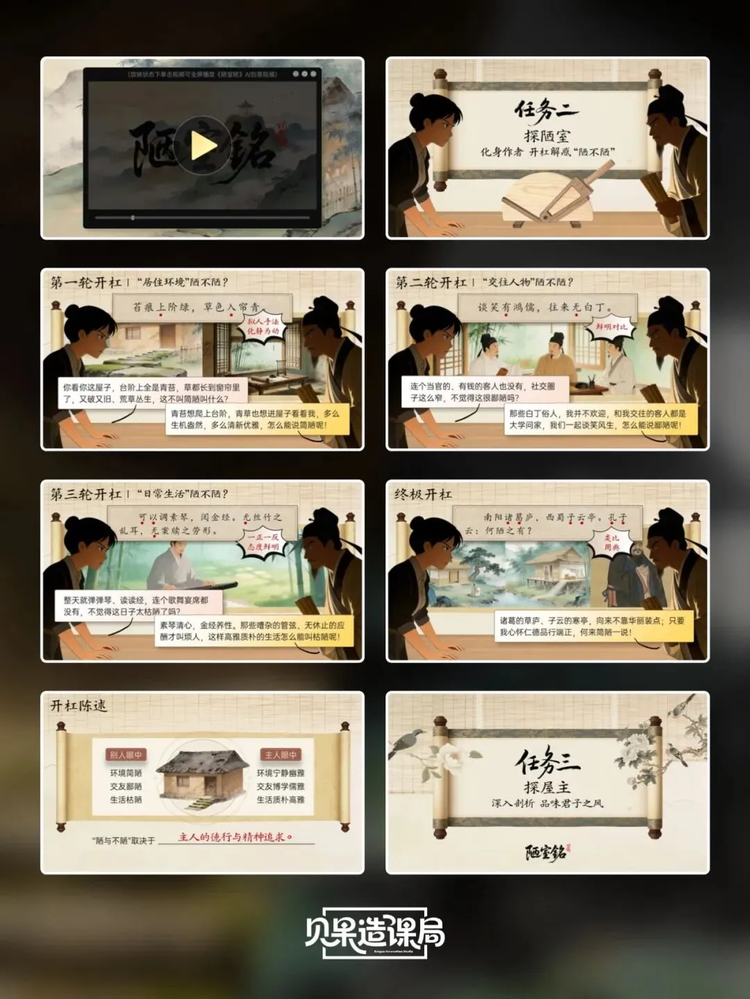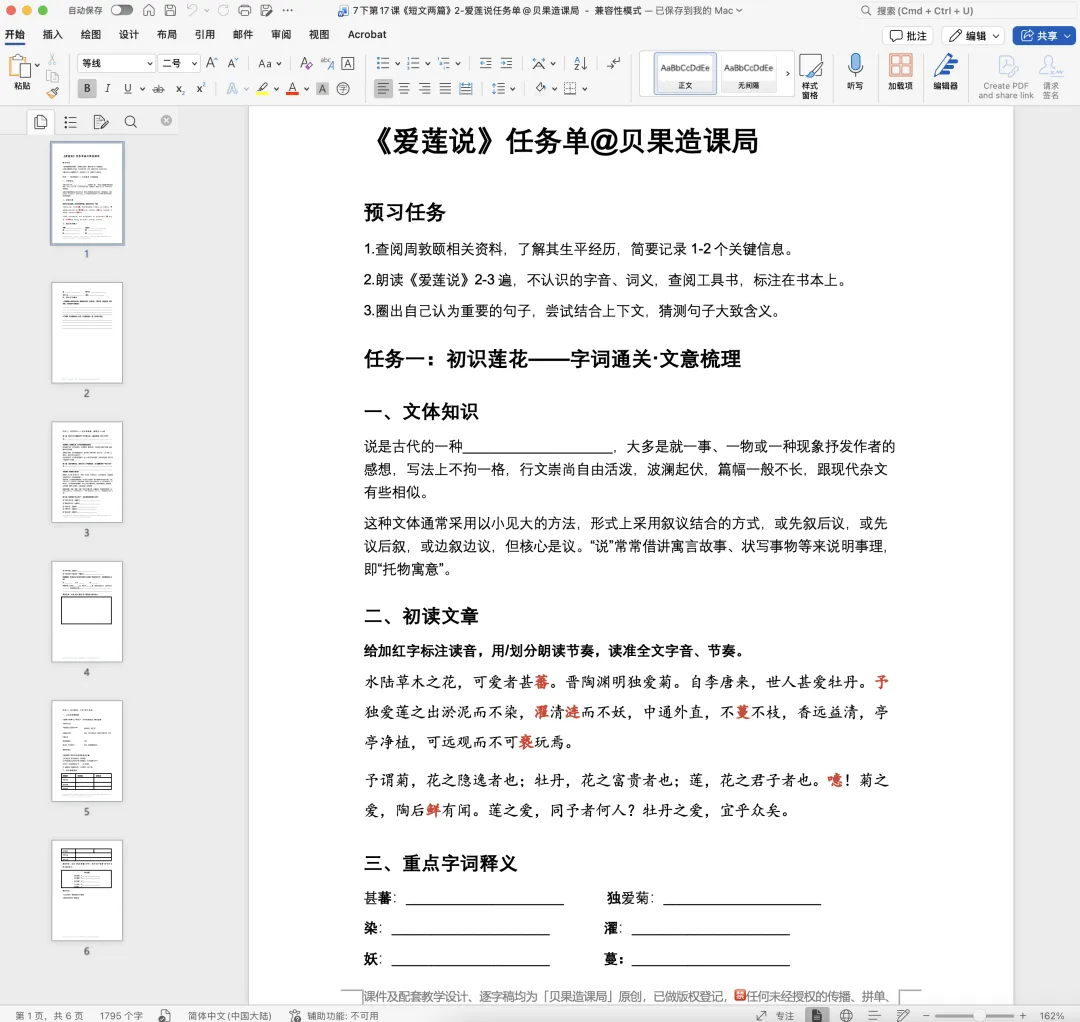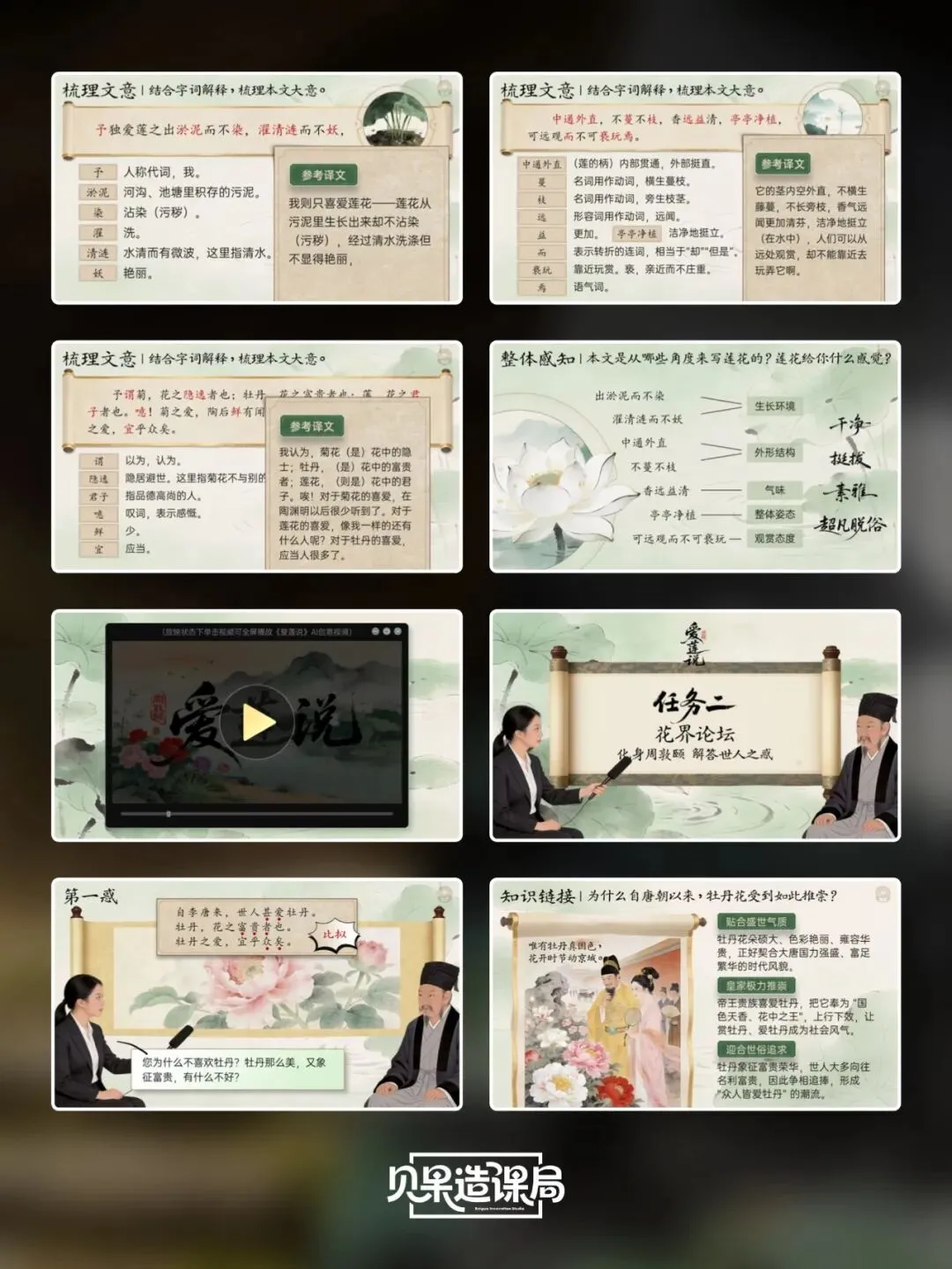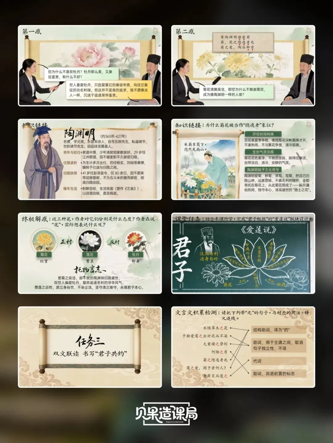 大家好~欢迎关注「贝果造课局」,今日分享统编版·七下语文第17课|《短文两篇》——《爱莲说》精品课件。本课情境设计:以学生设计“君子”主题板报为情境贯穿,课时1聚焦《陋室铭》,通过三读课文、情境开杠等环节理解刘禹锡安贫乐道的君子品格,完成板报《陋室铭》部分设计;课时2学习《爱莲说》,通过朗读课文、字词学习、花界论坛等环节,掌握莲花与君子的关联;最后双文联读、提炼共性,共同制定班级“君子共约”,完成最终板报设计,实现文言积累、文本理解与品德涵养一体化。(虚拟商品一经售出无法退换,请购前查看下方课件预览是否符合需求,购买方式在文章末尾)为感谢所有一直支持我们的粉丝朋友们,所有的商品均可扫码后先领券,新老客户可领取不同券额的优惠券!(如之前购买过我们课件,但没有领取老客优惠券成功的,可联系客服核对订单改价)点击我们课件商城→找到上方已购→点击已购商品→下拉找到资料模块即可下载。建议电脑下载,文件打开和编辑更方便哦~