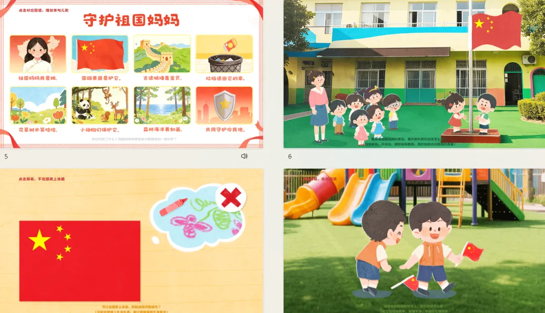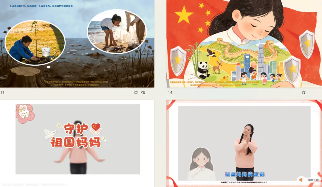 小结:祖国妈妈需要大家一起守护,爱护国旗、保护古迹、不乱扔垃圾、不摘花草、保护动物和它们生活的家园……这些都是保护祖国妈妈的好方法,能让她更加安全、更美丽。