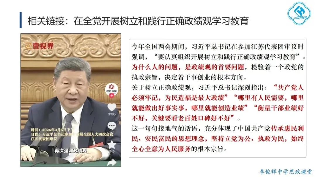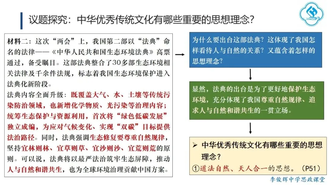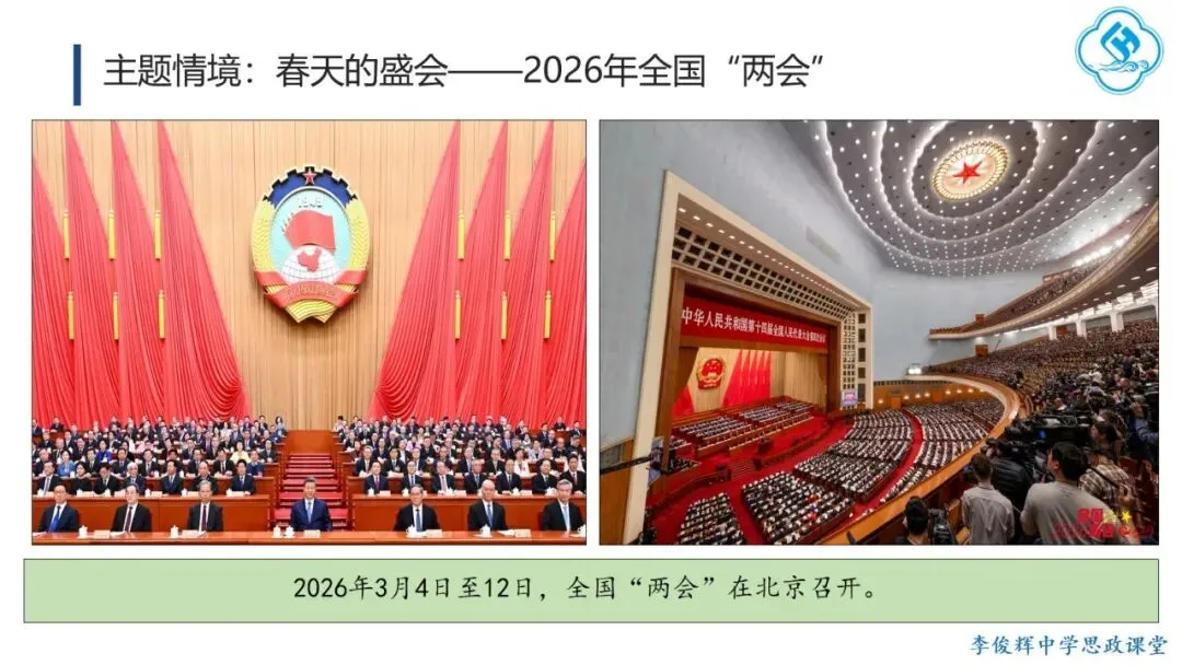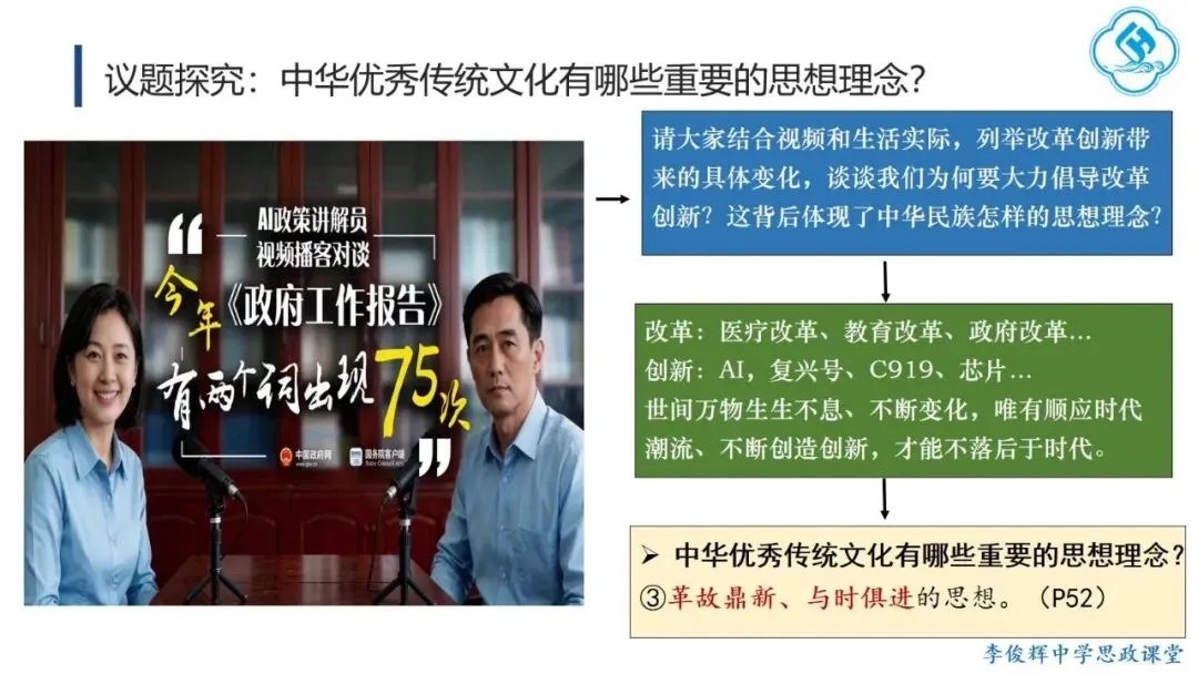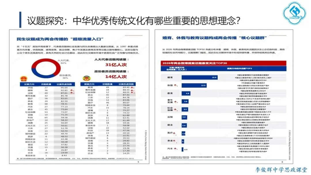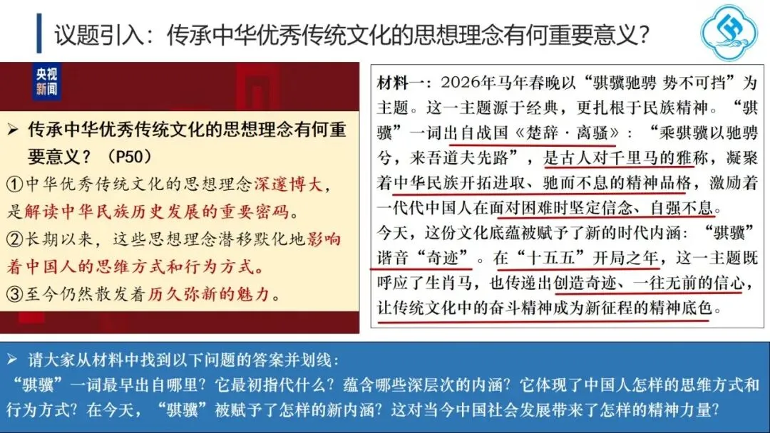 课堂以今年央视春晚主题“骐骥驰骋,势不可挡”导入,通过解析“骐骥”的来源、内涵与时代意涵,帮助学生体会中华优秀传统文化思想理念的深邃博大,理解其对民族历史与思维方式的影响,认同其时代价值,从而全面理解传承传统文化的“意”。主体环节聚焦今年全国两会“大事记”,引导学生思考哪些思想理念至今仍影响我们,读懂其中的“义”。首先,学生通过阅读《生态环境法典》相关内容,阐明其意义,理解“道法自然,天人合一”的理念,并结合二十四节气,体会人与自然和谐共生的传统智慧。进而,学生观看“十五五”规划视频,通过概括规划关注的议题,联系现实生活,理解其现实关怀与目标愿景的结合,领会“脚踏实地、实事求是”的理念,并了解“实事求是”的由来与党的新发展,增强对这一思想路线的认同。今年《政府工作报告》中“改革”与“创新”被提及75次。学生通过视频和实例,阐释“革故鼎新、与时俱进”的意义,并结合历史知识,回顾中华民族的改革创新历程,认同其内生基因,自觉践行这一理念。最后,学生结合两会提案议案关注的热点领域,理解“惠民富民、安民利民”的理念,追溯孔子“庶、富、教”思想的历史影响,并联系习近平总书记关于正确政绩观的论述,阐明党坚持立党为公、执政为民的宗旨,增强对党的领导的政治认同。教学提示:一是作为思政课的文化模块,要体现政治性,不能就文化讲文化,而要将文化与政治相联结,引导学生理解党和政府的施政理念植根于千年传统文化,从而增强政治认同。二是紧扣标题《历久弥新的思想理念》,抓住“久”与“新”两个关键词,既要讲清传统思想理念的源远流长,也要阐明其对当代的价值与深远影响。