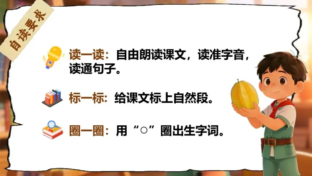教师:课件(含杨桃图片、五角星、生字词卡片、对比朗读表格、智慧卡片模板)、实物杨桃(若条件允许)。学生:预习课文,标注自然段序号。
