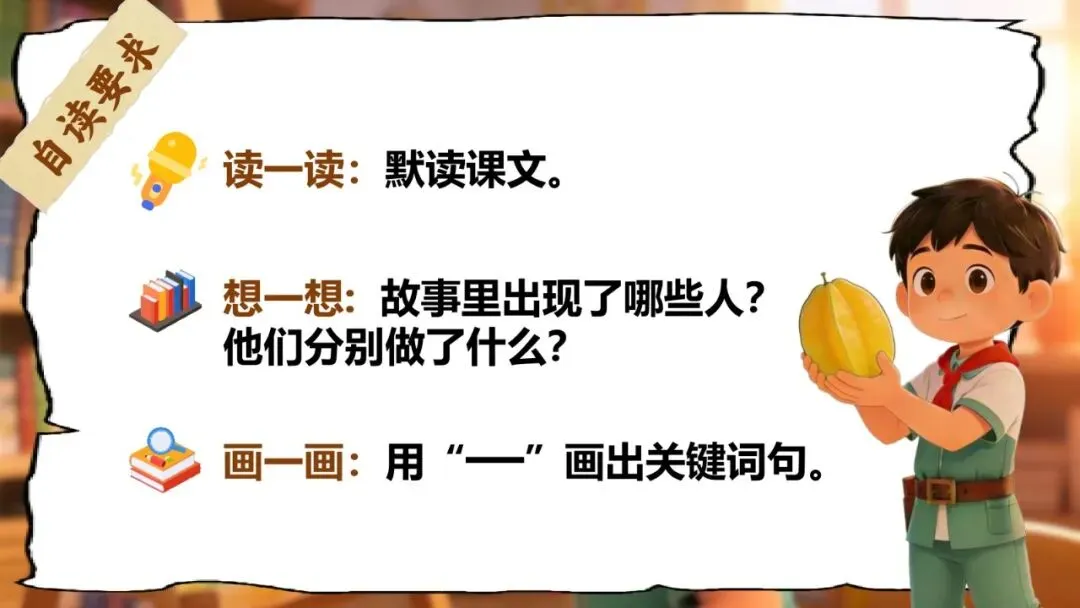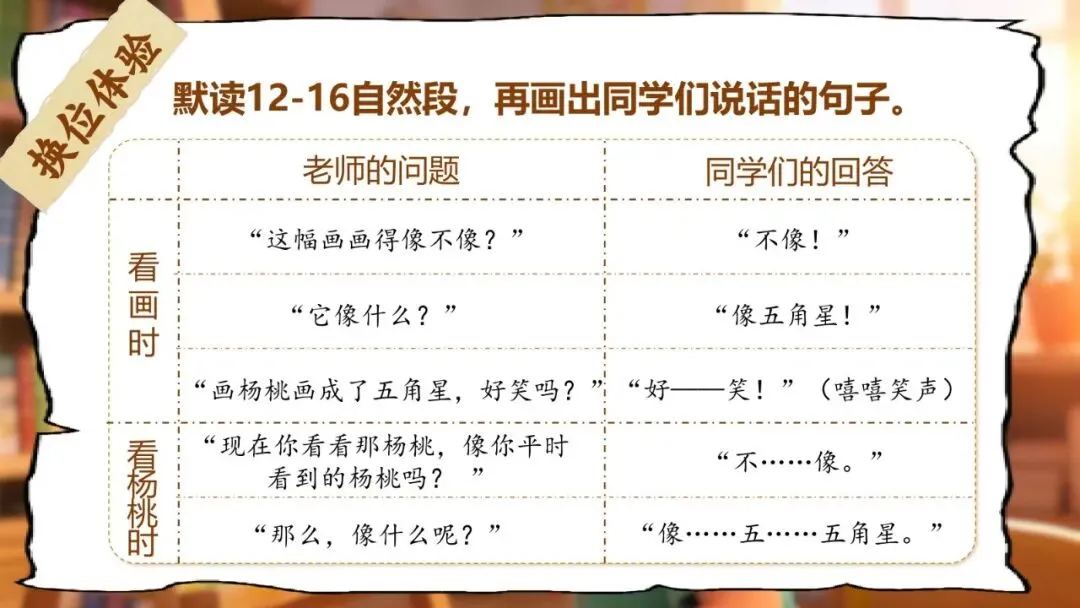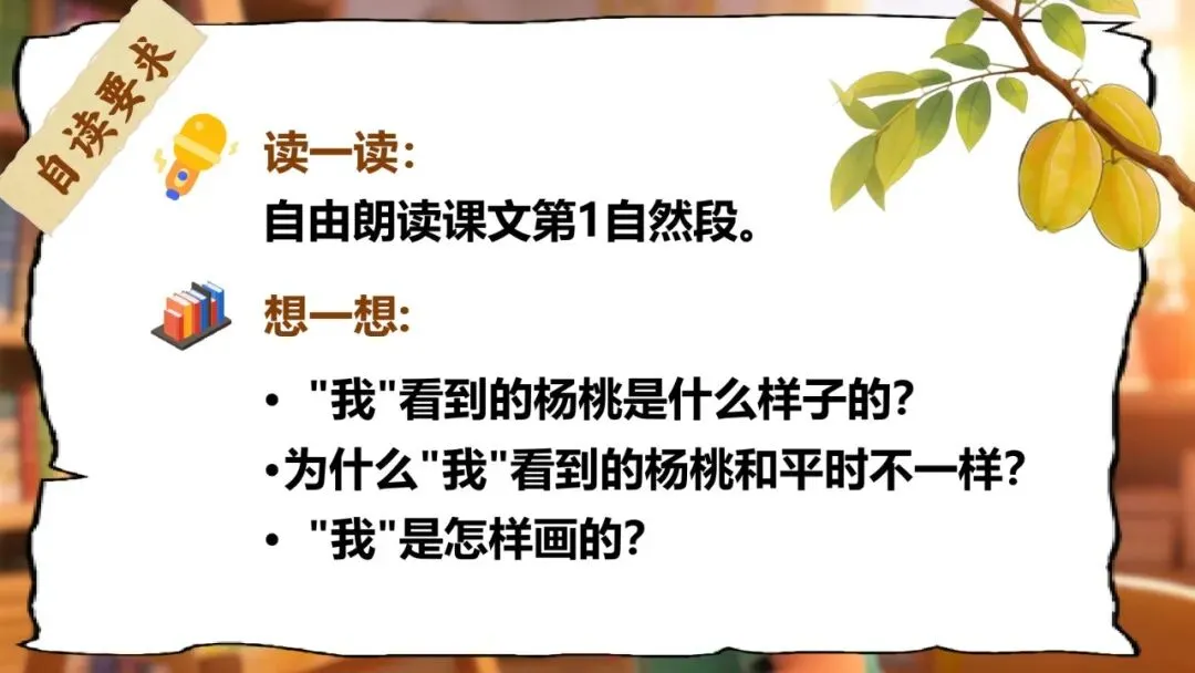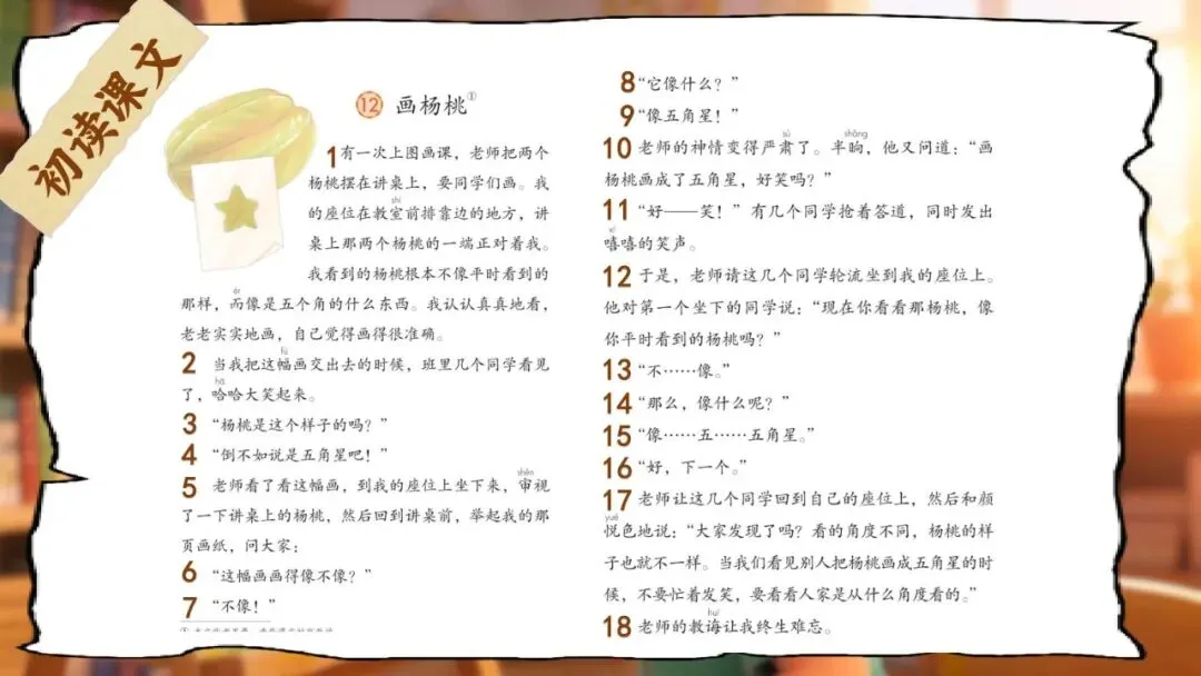 第三关:杨桃视角站 | 《画杨桃》 | 2课时 | 画杨桃画成五角星,到底对不对?你同意谁的说法? | 说清楚故事中态度的变化+完成"智慧卡片③" |
