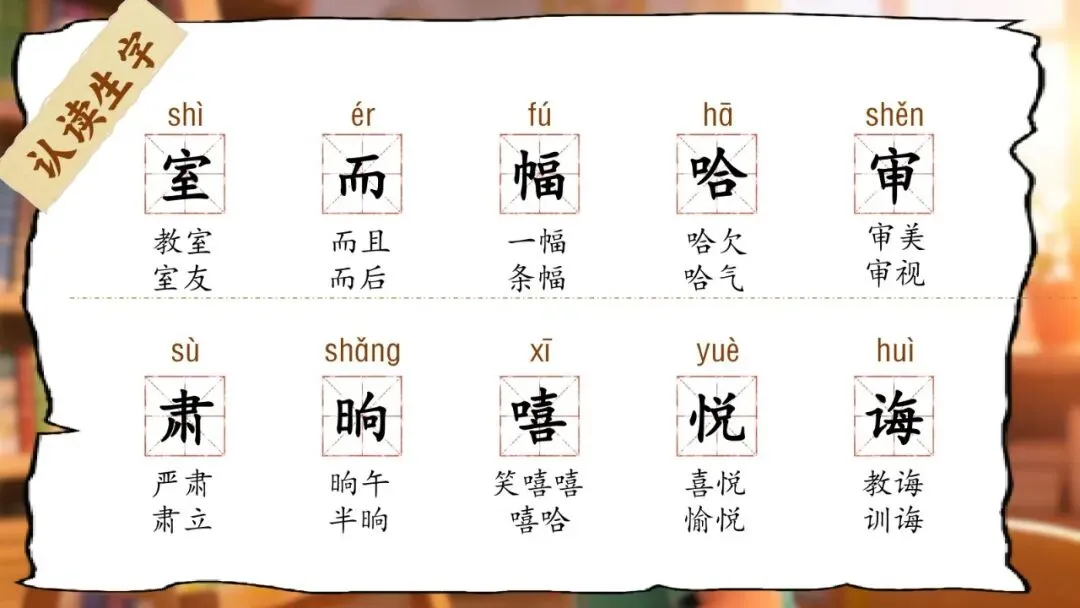 •认识"室、而、幅、哈、审、肃、晌、嘻、悦、诲"10个生字;会写"室、排、而、实、候、班、哈、举"8个字。