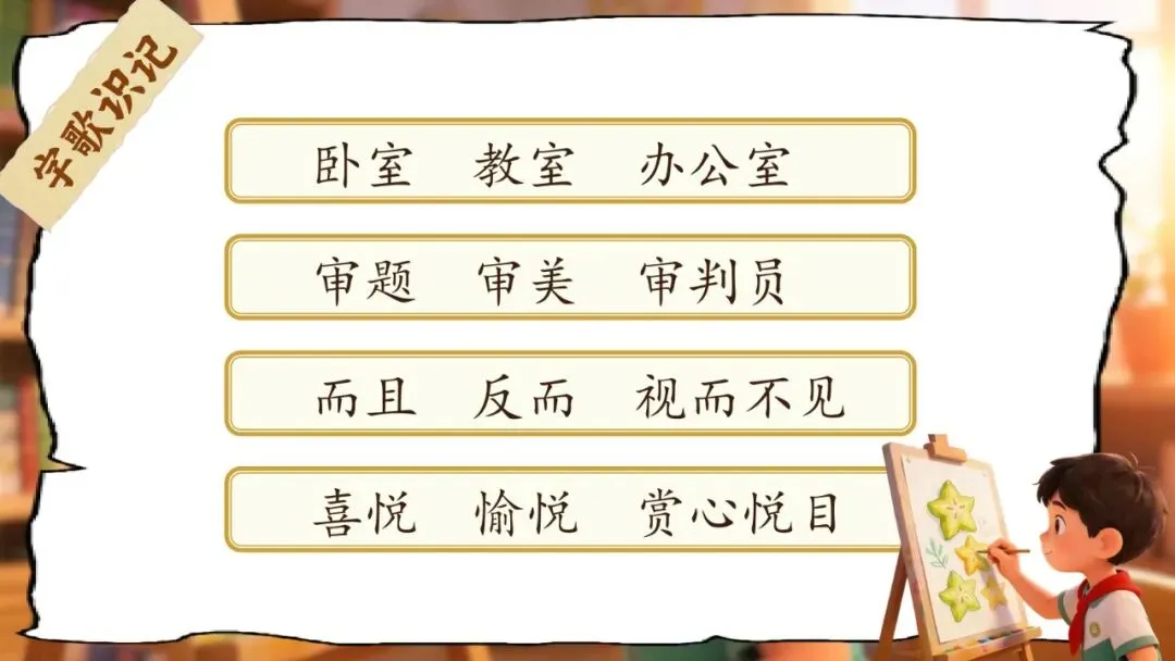 •能积累"室、而、审、悦"等字拓展的词语(卧室 教室 办公室;而且 反而 视而不见;审题 审美 审判员;喜悦 愉悦 赏心悦目)。