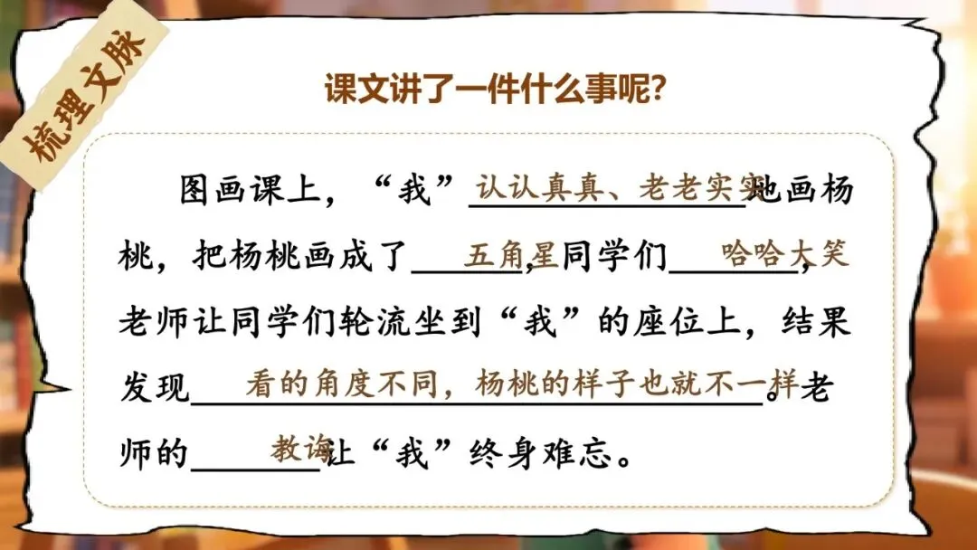 图画课上,"我"认认真真、老老实实地画杨桃,把杨桃画成了五角星的样子,同学们哈哈大笑,老师让同学们轮流坐到"我"的座位上,结果发现看的角度不同,杨桃的样子也就不一样。老师的教诲让"我"终生难忘。