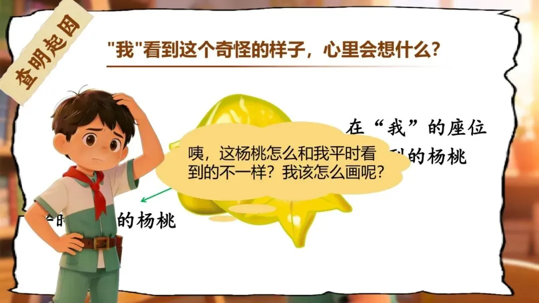 师:同学们,今天我们要走进第三关——杨桃视角站!在这个关卡里,我们要当一回小小观察员,亲自站在不同位置看一看杨桃。同样一个杨桃,从正面看、侧面看、从我的座位看、从你的座位看,样子会一样吗?今天我们就带着这个问题,一起走进课文《画杨桃》,去发现观察角度里的小秘密。(板书课题)