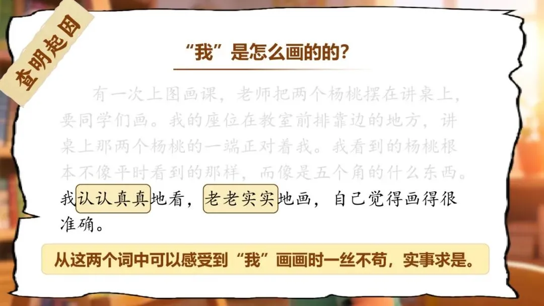 师:这两个叠词你们发现了吗?"认认真真""老老实实"——说明"我"画画时怎么样?(一丝不苟、实事求是)