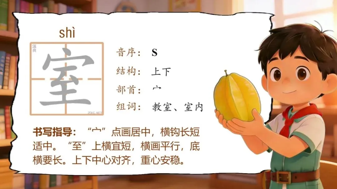 室(shì):“宀”点画居中,横钩长短适中。“至”上横宜短,横画平行,底横要长。上下中心对齐,重心安稳。