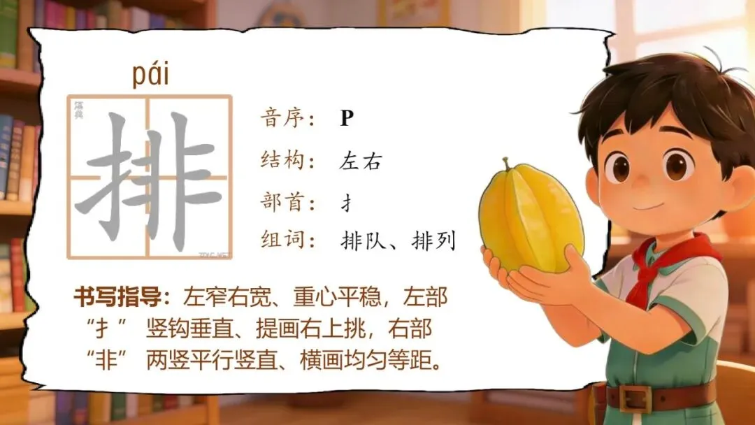 排(pái):左窄右宽、重心平稳,左部 “扌” 竖钩垂直、提画右上挑,右部 “非” 两竖平行竖直、横画均匀等距。