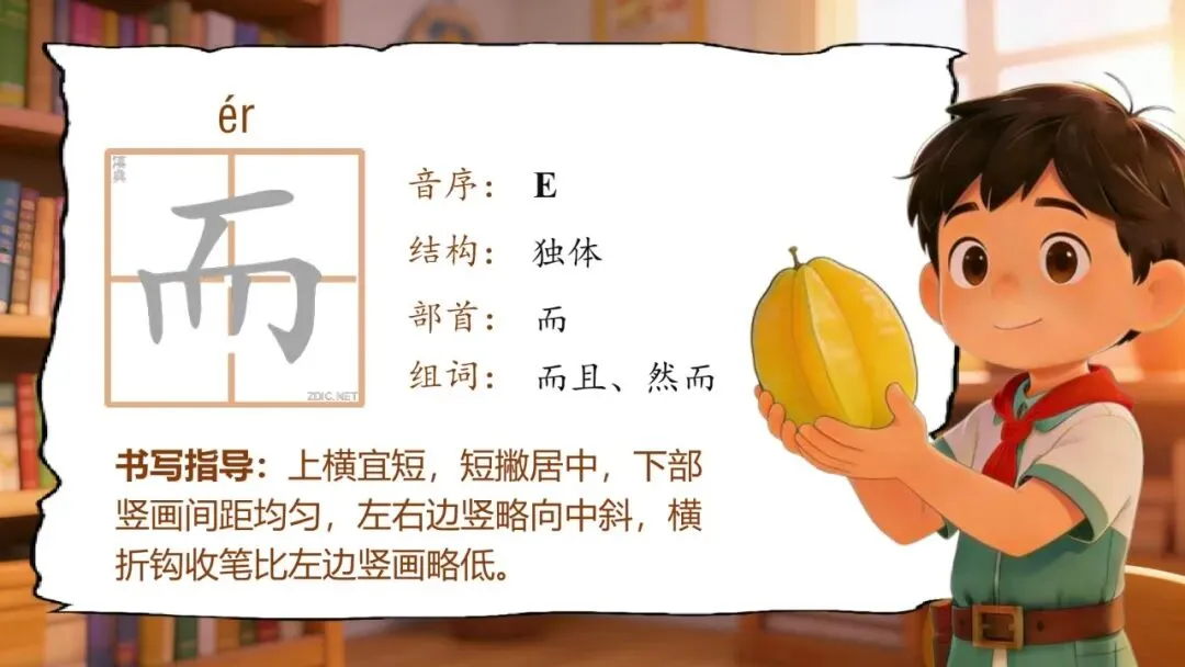 而(ér):上横宜短,短撇居中,下部竖画间距均匀,左右边竖略向中斜,横折钩收笔比左边竖画略低。