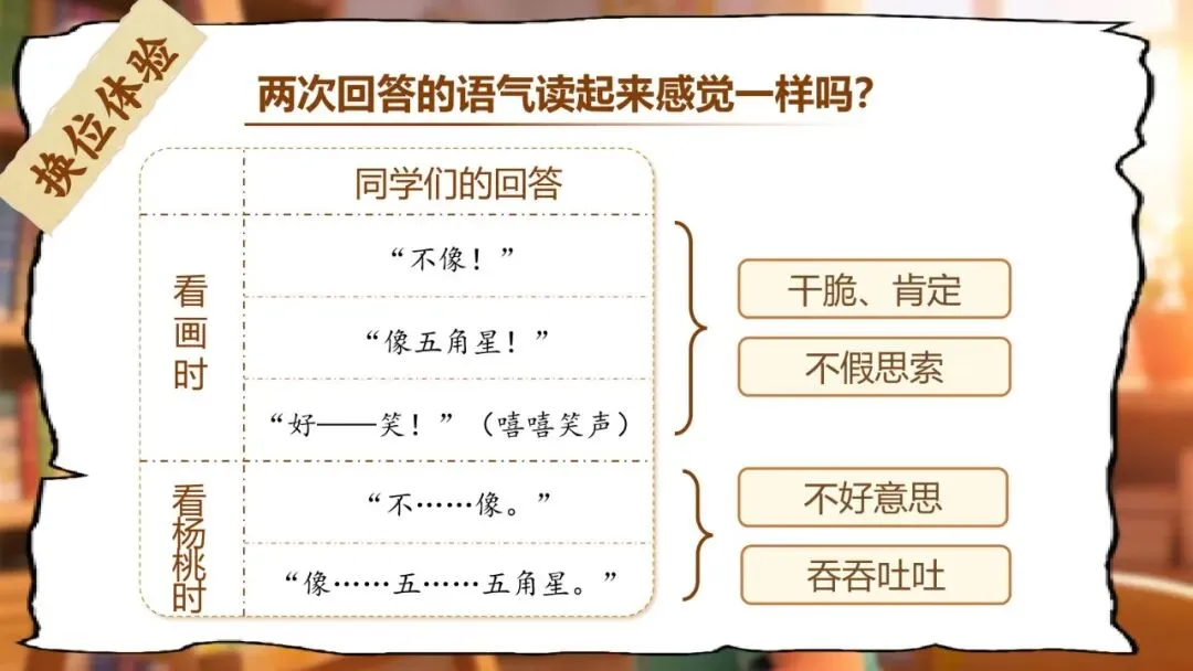 •同学们第二次回答时,语气低沉、断断续续、难为情("不……像。""像……五……五角星。"),读时要有停顿感;