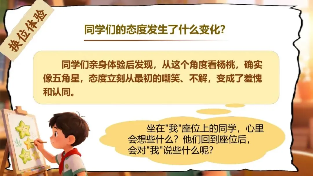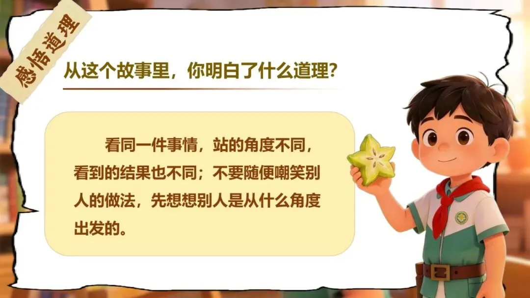 师:这就叫做——换位思考!当你站在别人的角度去看,才能真正理解别人的做法。