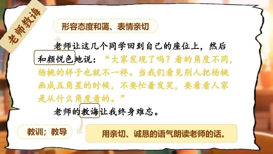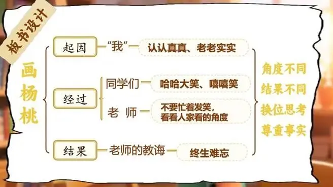 老师看了看"我"的画,走到"我"的座位上坐下来,仔细看了看讲桌上的杨桃,然后回到讲桌前,举起"我"的画问大家像不像。看到同学们嘲笑"我",老师请嘲笑"我"的同学轮流坐到"我"的座位上,让他们自己看一看杨桃是什么样子的。最后,老师和颜悦色地告诉大家:看的角度不同,杨桃的样子也不一样,不要随便嘲笑别人。