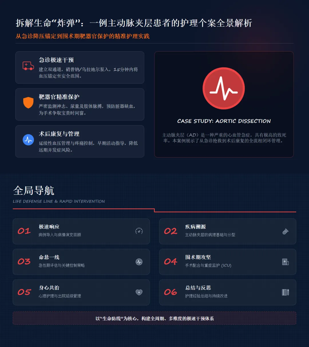#主动脉夹层护理个案#主动脉夹层围术期护理#心血管急危重症护理#急诊降压靶点控制#硝普钠乌拉地尔泵入#ICU重症监护管路护理#引流管活动性出血监测#靶器官缺血监测评估#家庭血压监测HBPM#主动脉夹层心理护理PTSD#心脏外科护理查房PPT#优质护理服务案例