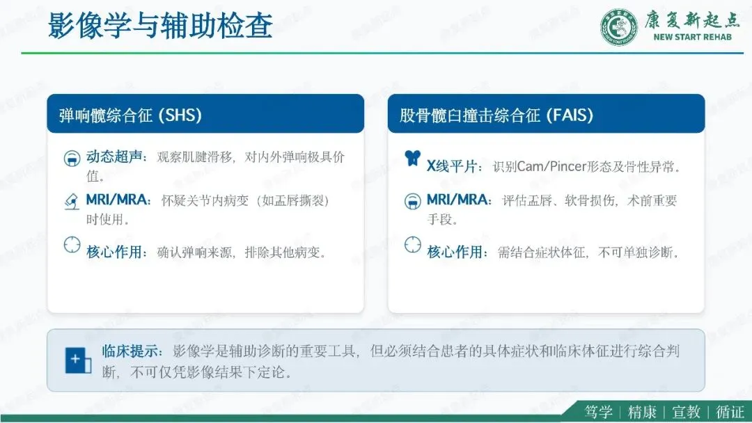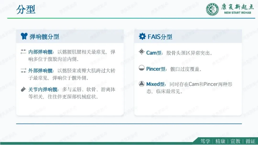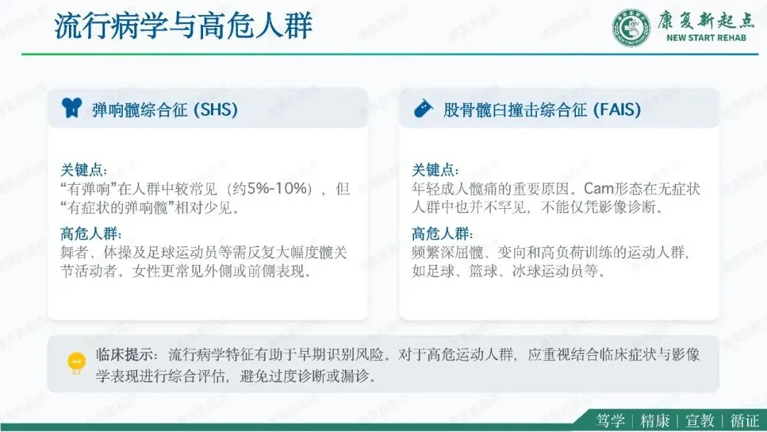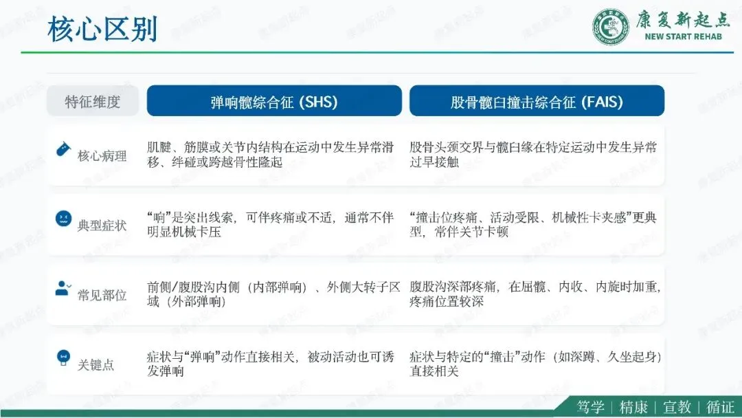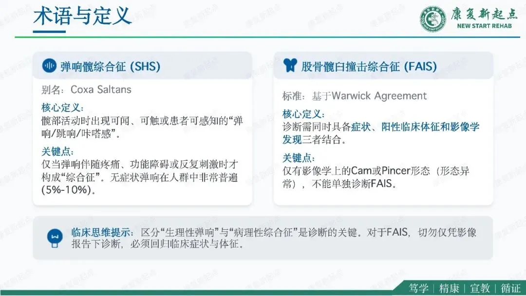 髋关节疼痛是骨科、运动医学与康复医学中的常见问题,其中弹响髋综合征与股骨髋臼撞击综合征是青年及中青年活动人群中最具代表性的两类机械性髋部疾病。二者均可表现为腹股沟区或髋周疼痛、活动受限及运动功能下降,临床上常伴随弹响、卡顿、夹挤感等机械性症状,因此容易混淆,且可同时存在。