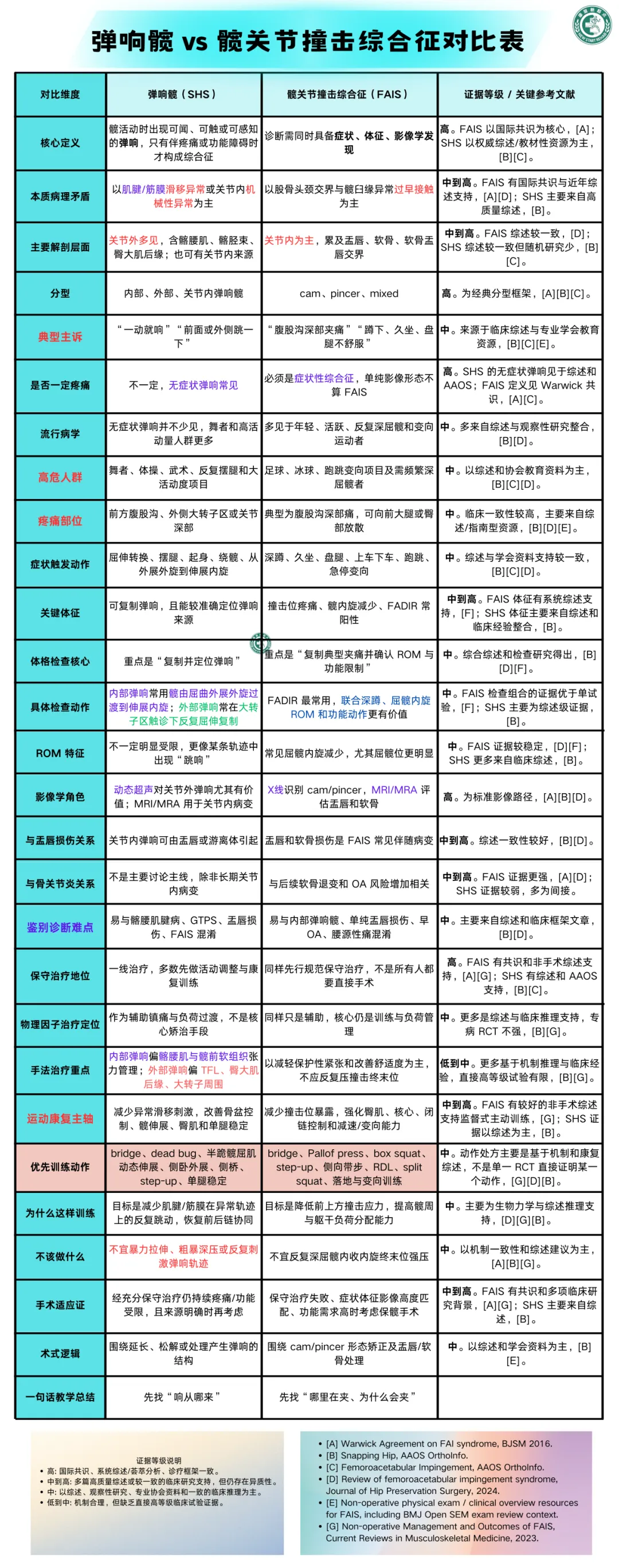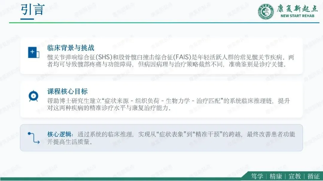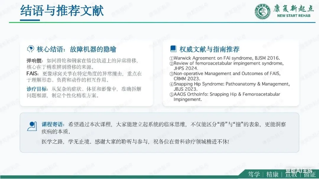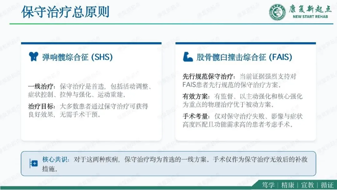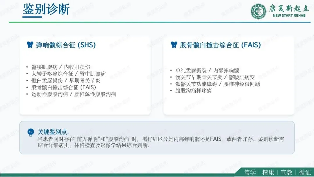 髋关节疼痛是骨科、运动医学与康复医学中的常见问题,其中弹响髋综合征与股骨髋臼撞击综合征是青年及中青年活动人群中最具代表性的两类机械性髋部疾病。二者均可表现为腹股沟区或髋周疼痛、活动受限及运动功能下降,临床上常伴随弹响、卡顿、夹挤感等机械性症状,因此容易混淆,且可同时存在。