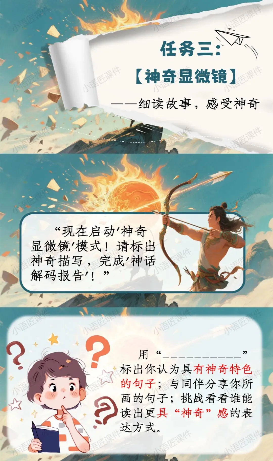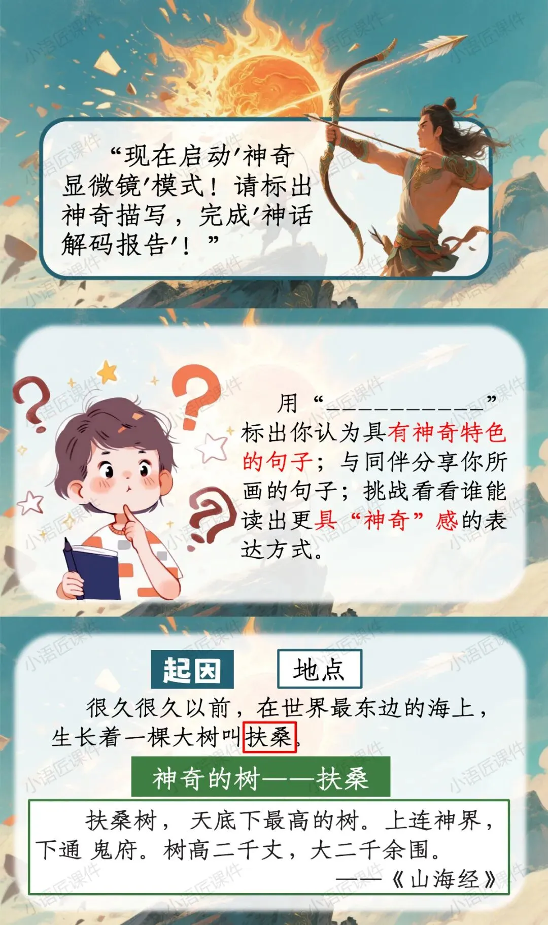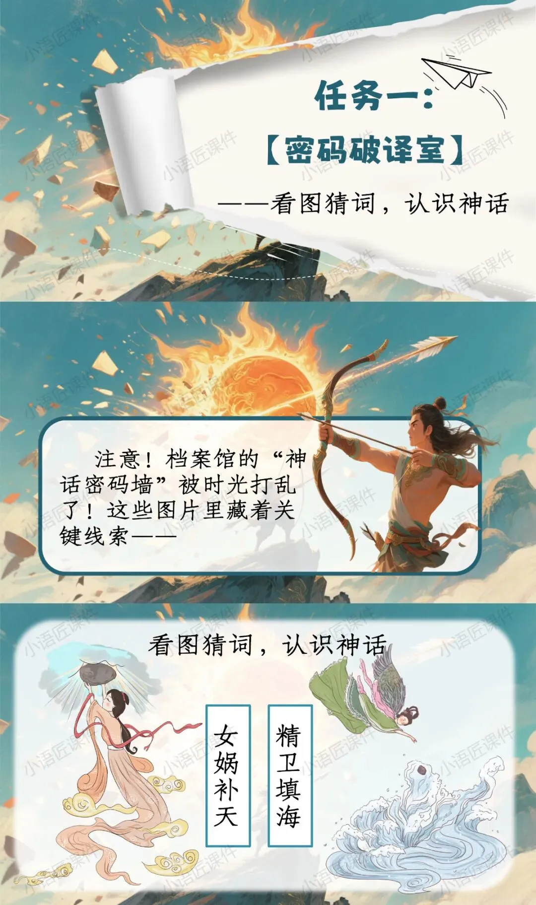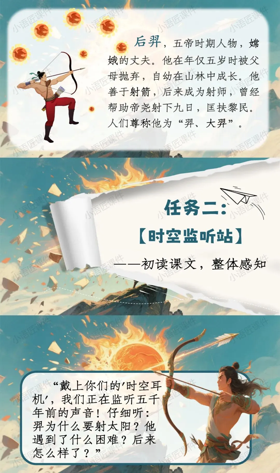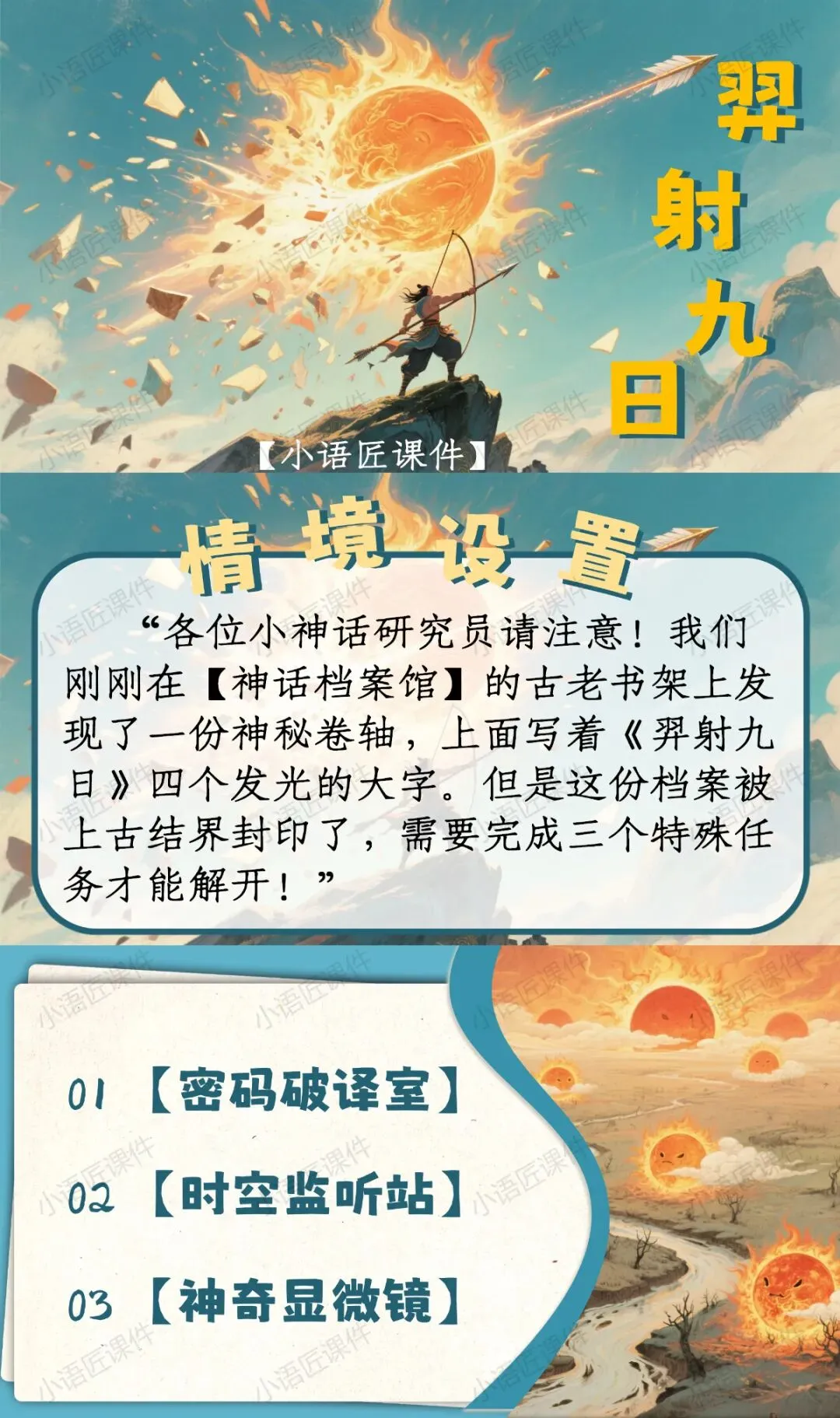 >【二下课件】情景设置:“穿越神话档案馆,破解'羿射九日'的神奇密码”——《羿射九日》(+教学设计!)