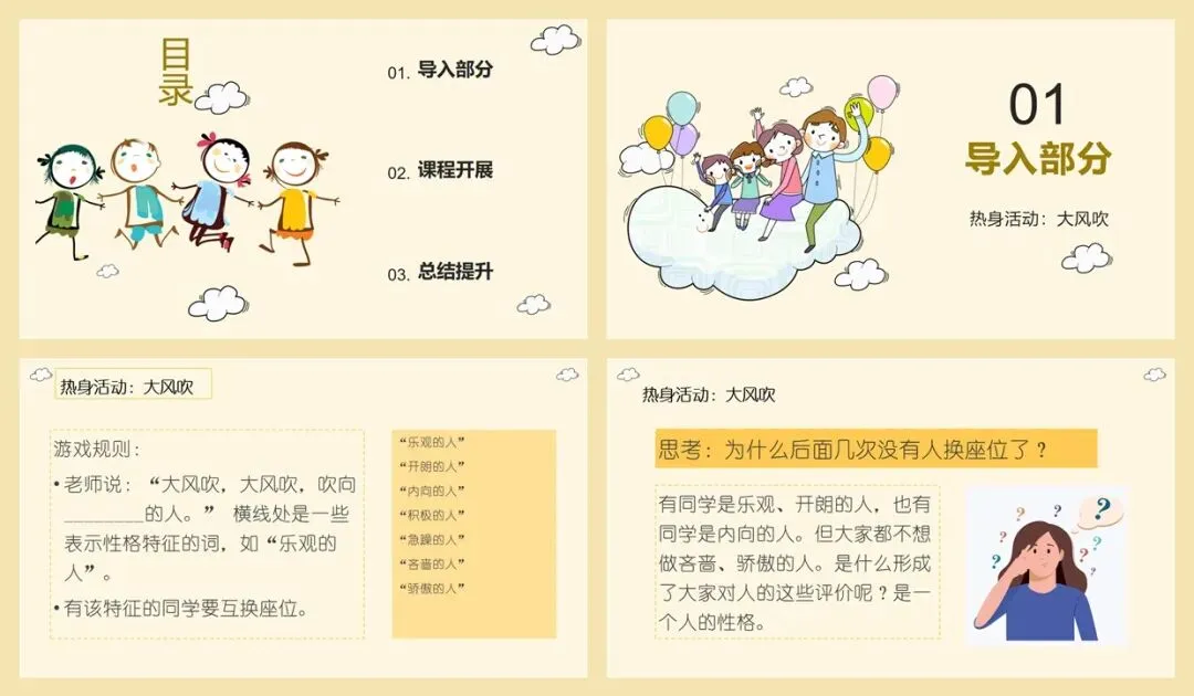 性格这个词对三年级学生来说比较陌生,但“一个人是什么样的人”对他们来说已经能够概括。通过“大风吹”这样的热身游戏,不仅调动了学生的积极性,活跃了课堂氛围,还让学生了解了“一个人是什么样的人”是由他的性格决定的,为后面环节打下基础。