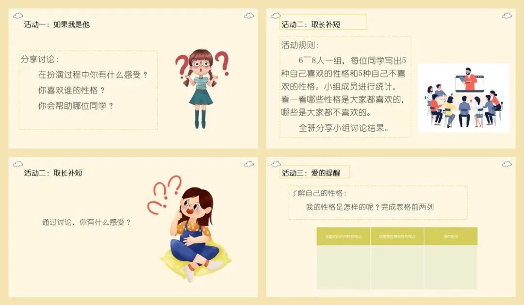 通过阅读事例、角色扮演激发团体动力,让学生了解不同的性格表现出来的行为是不一样的,并表达出对不同性格的看法。