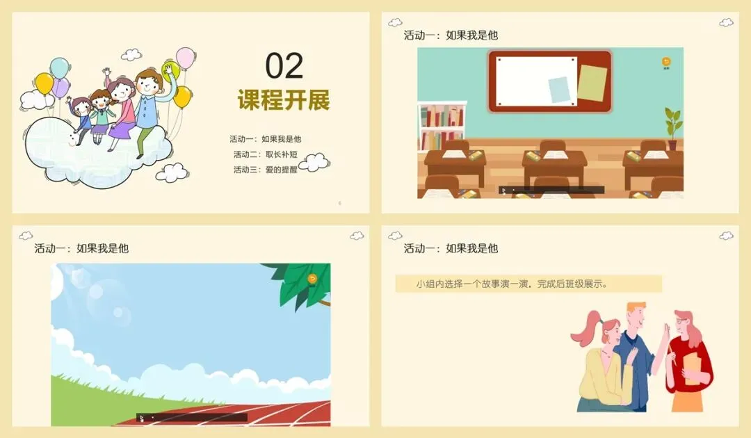 (4)教师提问:①在扮演过程中你有什么感受?②你喜欢谁的性格?你会帮助哪位同学?