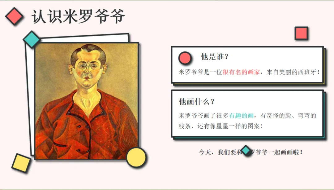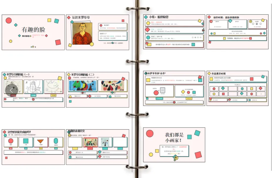 虽然第一个AI平台能有那么好的效果已经很让我惊喜,但Kimi在视觉输出上却有一个明显的“前后落差”问题:前半部分(第1-7页,欣赏环节)图文搭配尚算用心,米罗作品、形状图示、表情符号,视觉元素丰富;但后半部分(第8-10页,创作环节):页面突然变得简陋——用的是文本框+文字+纯色块形状。