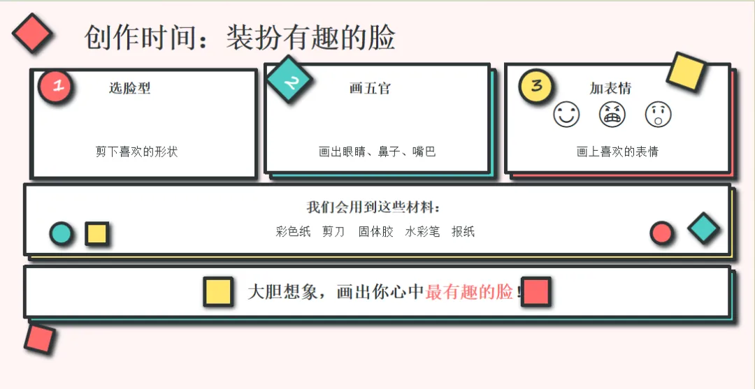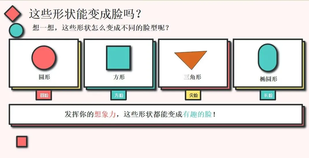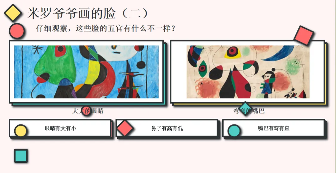 大家有没有发现,在PPT中Kimi在哪个环节花了最多的笔墨?显然是欣赏环节。欣赏与感受是表达与创造的前提。面对一个新的画风、新的艺术表达方式、新的艺术概念,其实我们都需要确保孩子有足够的时间理解与消化,才能更好地再进后续的转化与表现。最让我感到意外的是,在欣赏了米罗的“有趣的脸”的作品后,Kimi并没有简单地把我提供的一些“苹果”、“面包”脸拿来当范例,而是选择了不同的形状让幼儿去辨别并和脸型做匹配——用圆形→圆脸、方形→方脸的图示,把抽象变具象——这种认知支架的设计,是教师视角的体现。