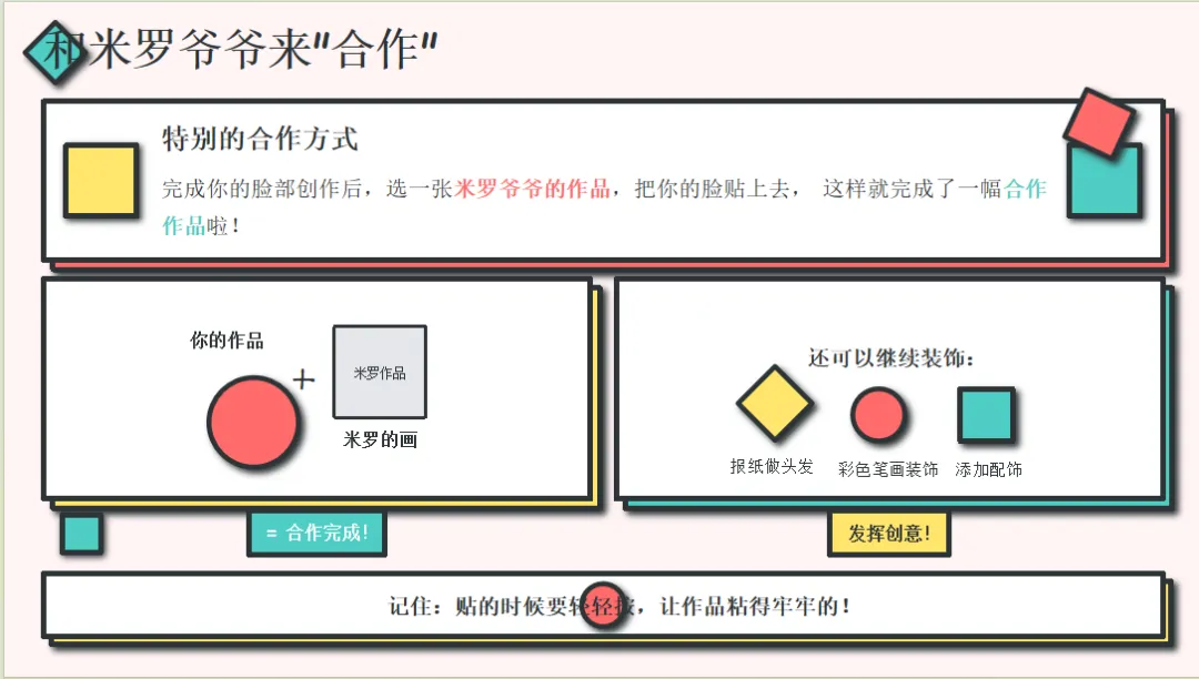 再来看创作环节,简简单单两页——一页介绍操作流程及材料;一页表达和米罗一起合作的巧妙设计,把更多的时间留给孩子们直接去实际操作,换做我们自己在美术活动中是否也是这样设计的呢?