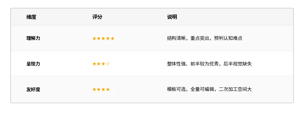 客观的说,我对Kimi的输出是满意的,因为他可以算得上是“听得懂话、改得了稿、审美在线”的备课搭档。它无需追问即可理解教案逻辑、给出可用课件,但视觉呈现的“最后一公里”仍需人工补足。[综合评价如下:]