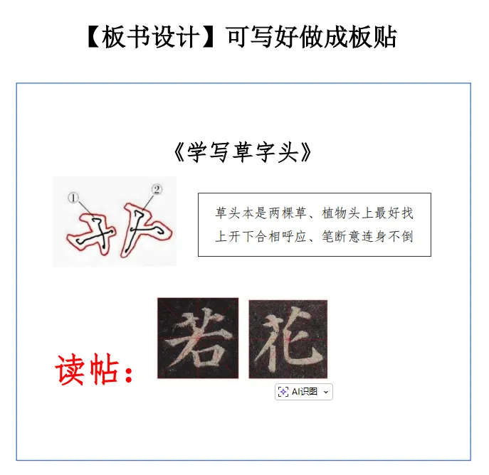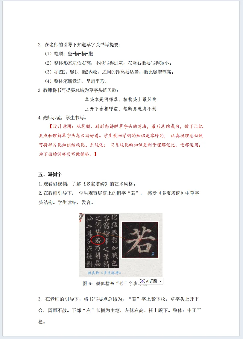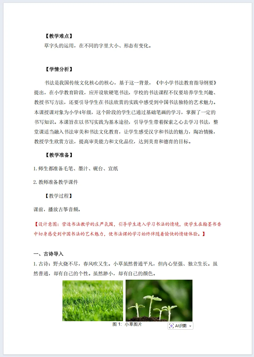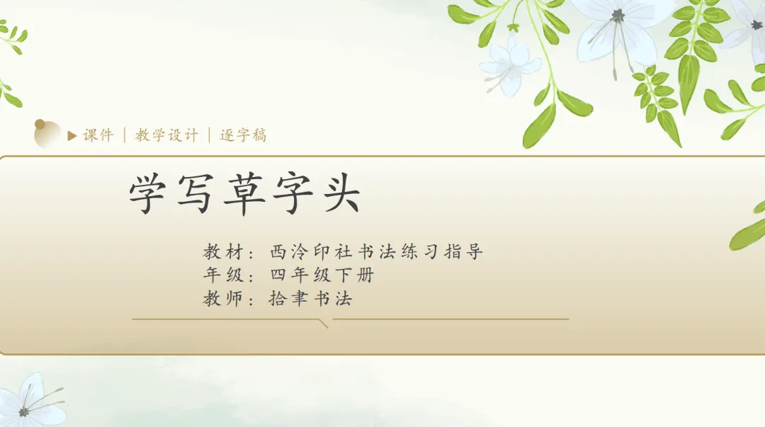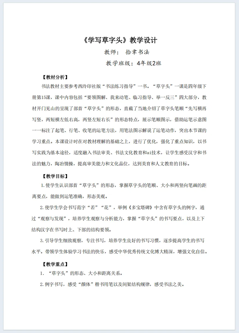 小草不与大树争高,不与鲜花比美,守着自己的姿态努力生长,这份谦逊和坚韧,值得我们每个人学习。而在汉字里,小草也有专属的“模样”,就是我们今天要学习的—— 草字头。这节课,让我们一起在书写中感受汉字之美,也学学小草的美好品格。【教材分析】书法教材主要参考西泠印社版“书法练习指导”一书。“草字头”一课是四年级下册第15课,课中内容包括“要领图解、我来动笔、临习指导、举一反三”四大部分,教材开门见山的呈现了部首“草字头”的形态,直截了当地介绍了草字头笔顺“先写横再写竖,两短横左低右高,两竖左短右长”的形态特点,展示笔顺图示,借助运笔示意图一一标注了起笔、行笔、收笔的运笔方法,用笔法图示解说了运笔动作,突出本节课的学习重点。本课设计时在对教材理解的基础之上,进行了优化,强化了重点知识,以书写实践为基本途径,适度融入书法审美、书法文化教育和ai技术,让学生感受汉字和书法的魅力,陶冶情操,提高审美能力和文化品位,达到美育和人文教育的目标。课堂基本信息
