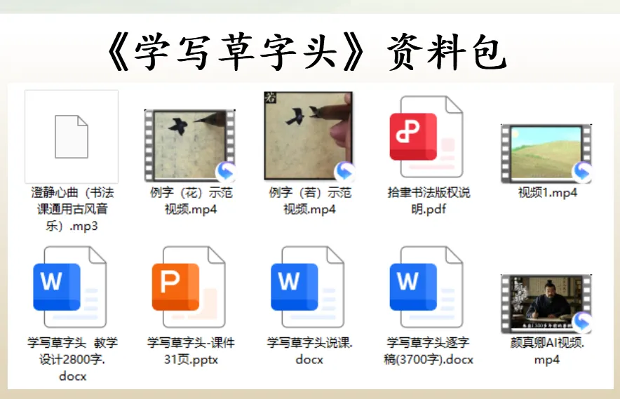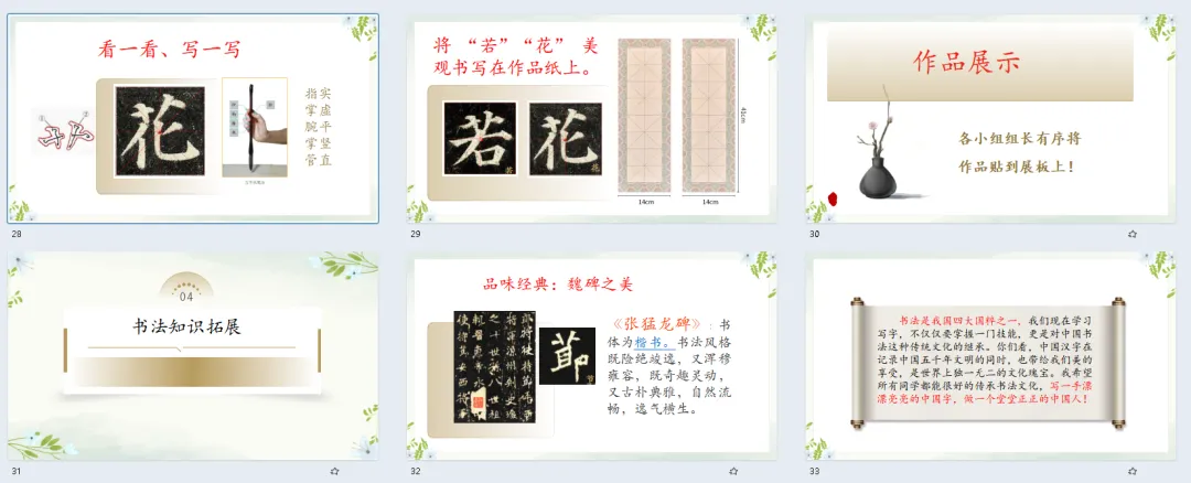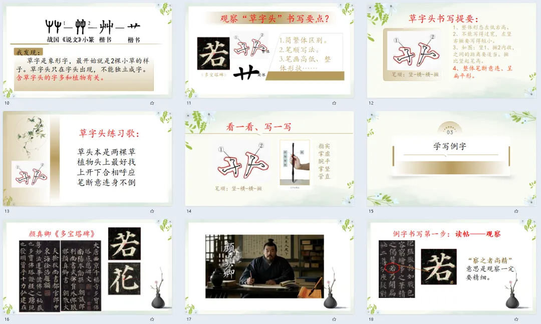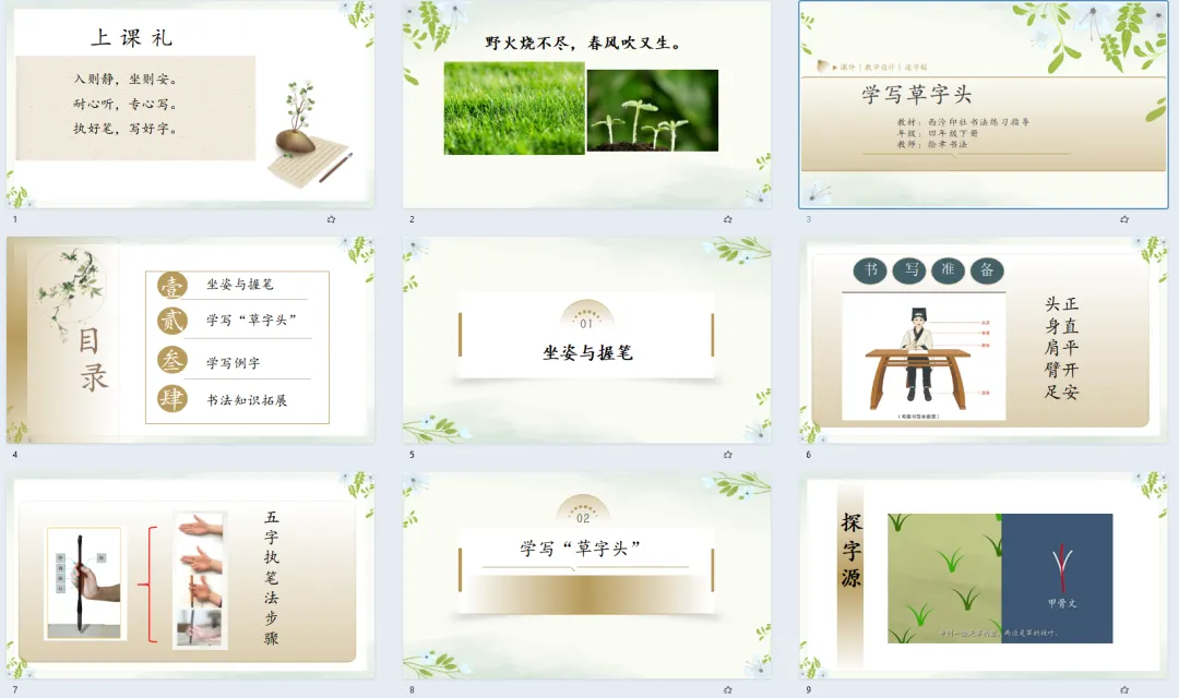 师:大家都有一双发现美的眼睛,把小草的美好品质都找出来了。小草不与大树争高,不与鲜花比美,守着自己的姿态努力生长,这份谦逊和坚韧,值得我们每个人学习。而在汉字里,小草也有专属的“模样”,就是我们今天要学习的—— 草字头(播放标题页)。这节课让我就一起在书写中感受汉字之美,也学学小草的美好品格(播放目录页)。