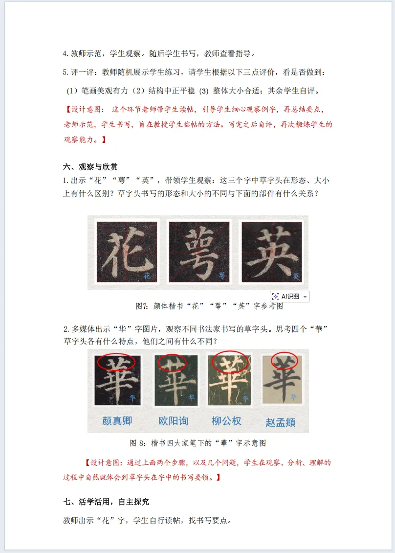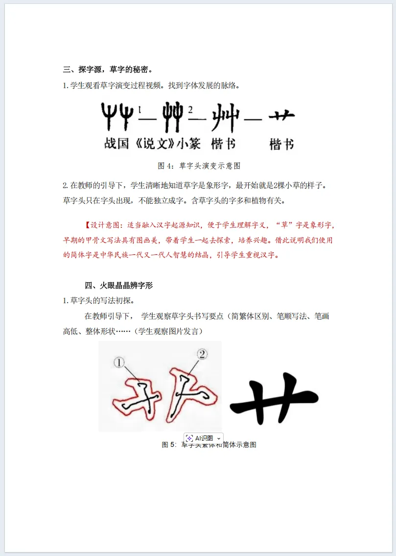 师:联想能力真强!像花、草、荷、莲,都是植物,古人用汉字描绘自然,这就是汉字的智慧。我们今天写好草字头,也是在传承古人的智慧,对待传统文化,就要有这样的探索之心......