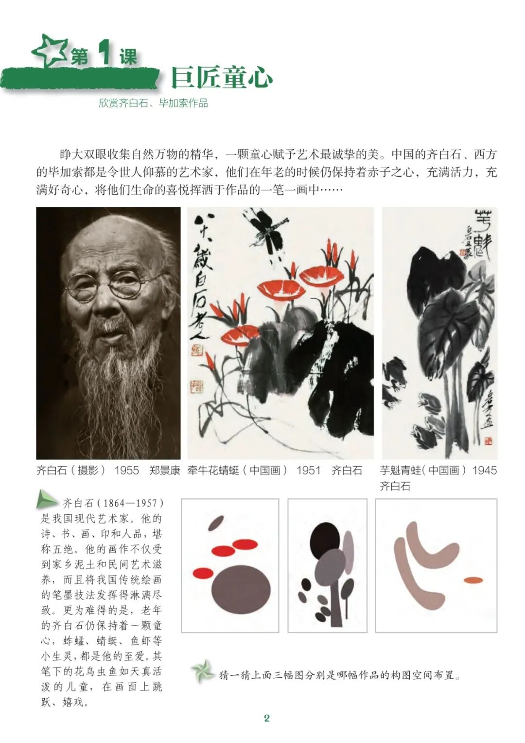 1.上次我们仔细了解了齐白石老爷爷,知道了中国近现代史上这么一位重要的具有一颗传奇 童心的国画巨匠,他的声名远扬,不仅在我们中国家喻户晓,就是在地球的另一边,在遥远的 欧洲,也为很多人所钦佩,其中还有这么一位巨匠级的人物曾谦虚的说:我不敢去中国,因为 中国有个齐白石,他是谁呢? 他就是毕加索!引出课题