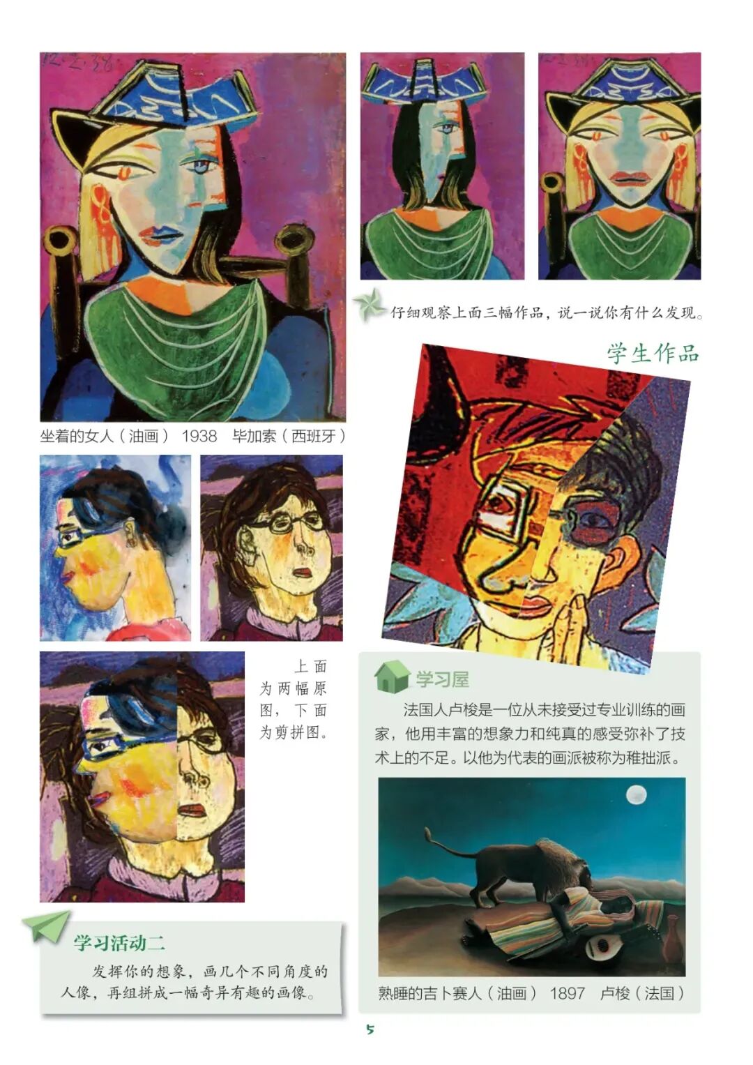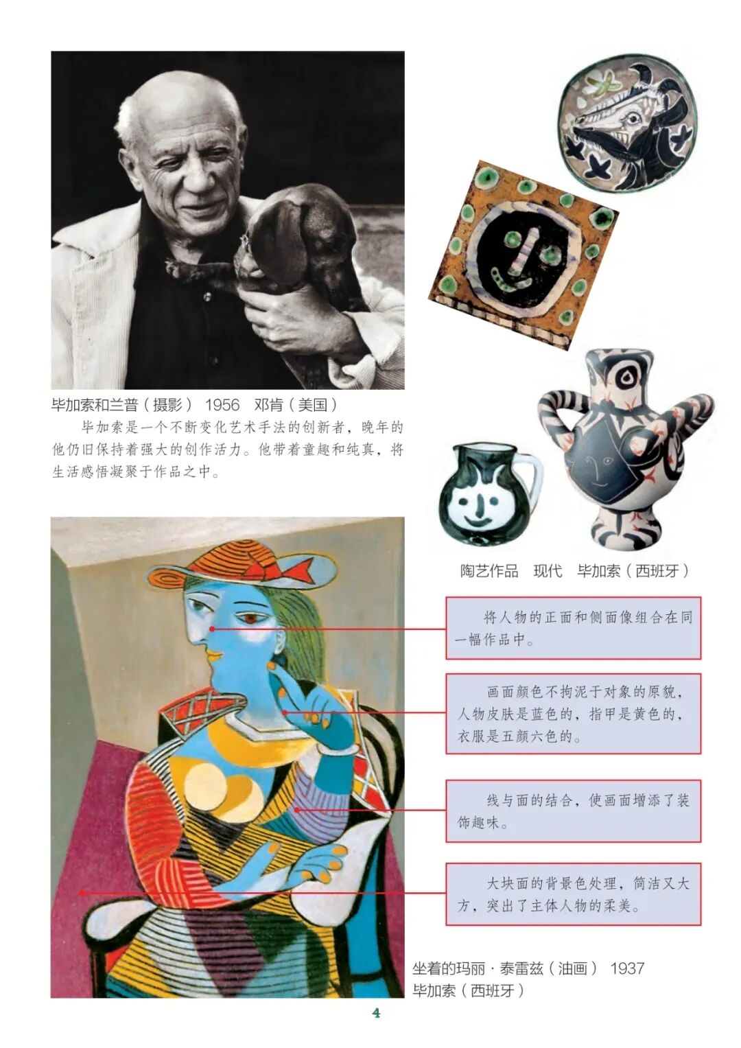 毕加索的作品充分体现了毕加索艺术的本真和童趣,他曾说自己“用了一辈子时间学习怎样 像孩子一样画画。” (3) 从这位画家身上你看到了什么?