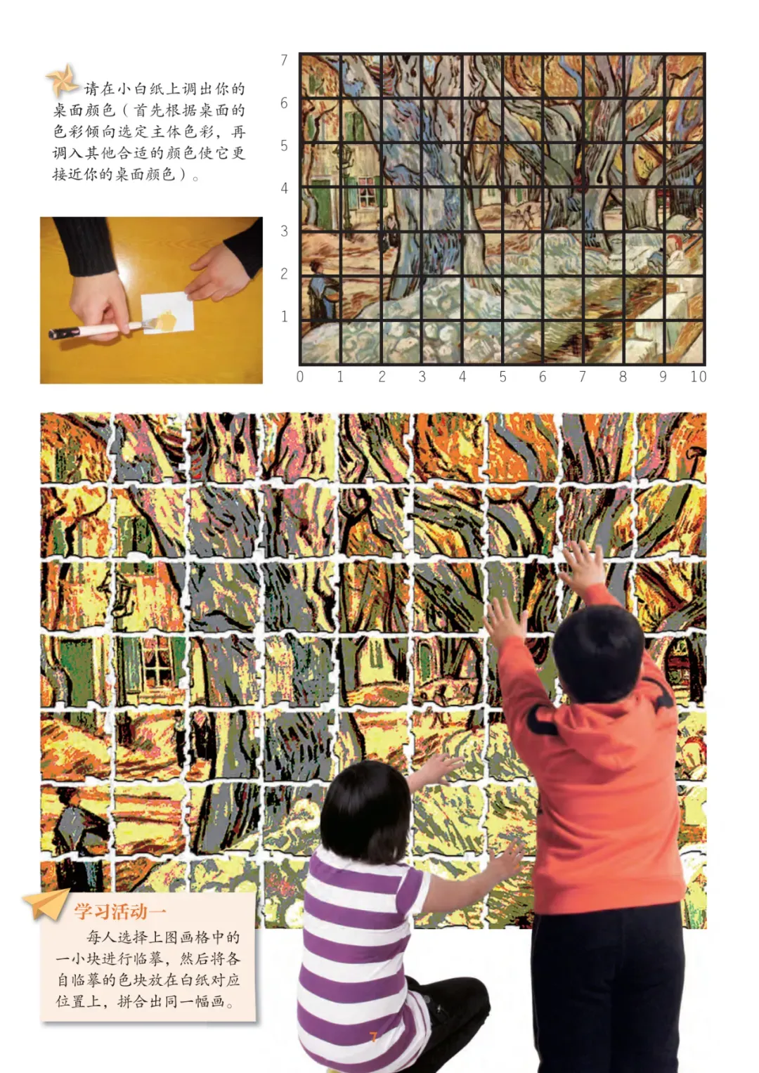(4)体验 4 :从教材右页马赛克效果的《向日葵》画中取一方格 (G5) ,这一格是由 24 个小块组成的,将它们分解开,与色谱中颜色相对比。我们一起调出这些颜色并涂画在纸上。师生合作,共同探讨。