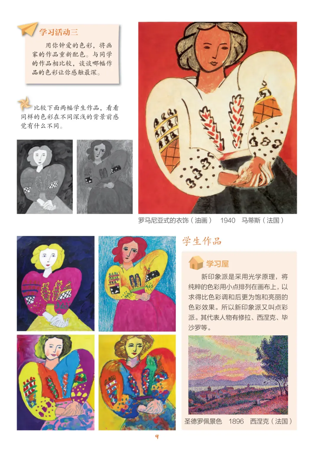 色彩是绘画的语言之一,研究色彩,表现五彩的世界是画家特别关注的,像修拉的点彩作品就给我们很多的启示,建议同学们也去试试,你会有更多创造性的发现。