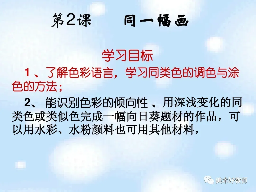 湘美版小学美术教材五年级下册第2课《同一幅画》教学目标:1、知识目标:了解色彩语言的丰富性,认识色谱,学习找准色彩与涂色的方法。