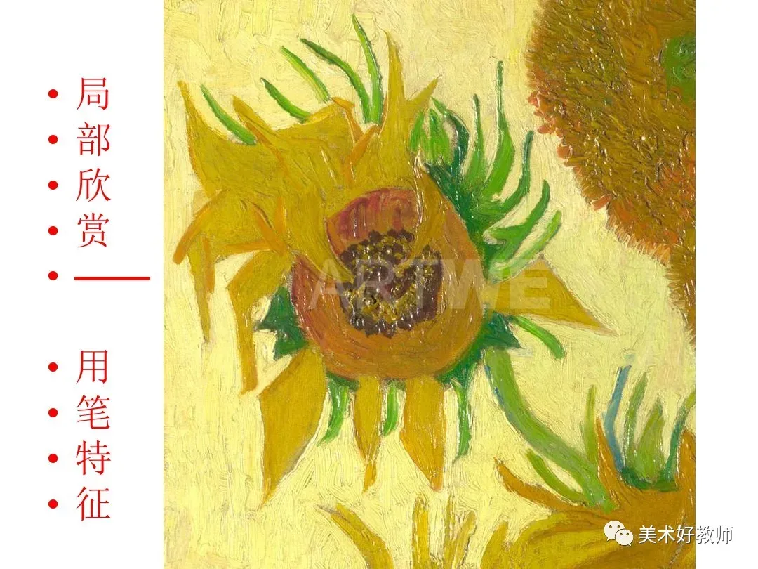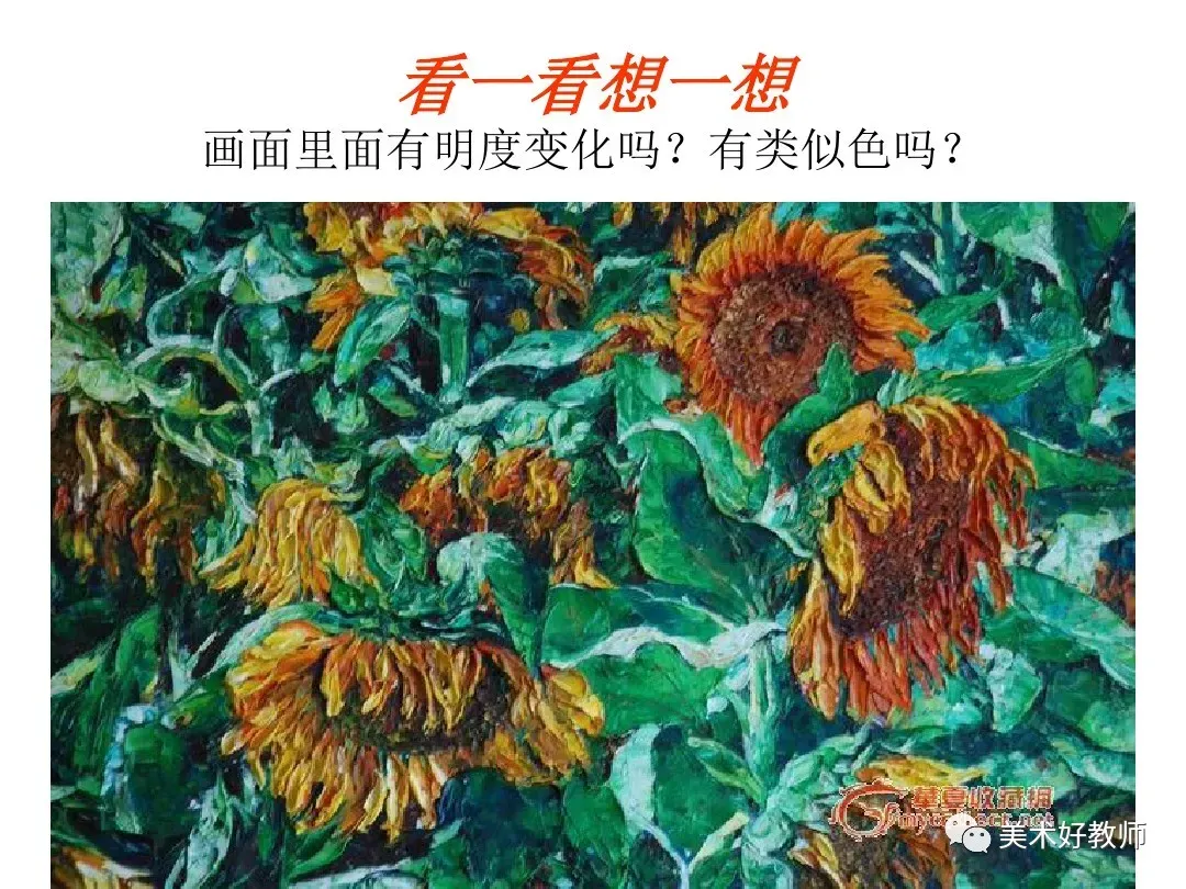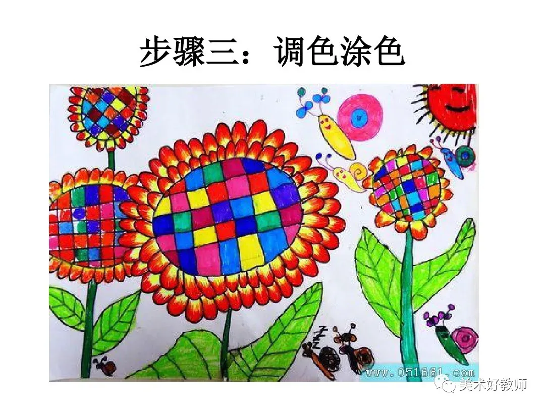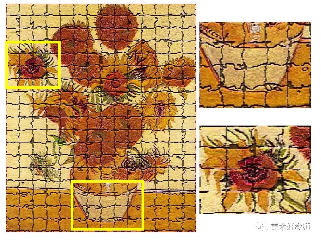 6、我们可以将这幅画分解成许多小色块,近看是些颜色。但远一点或眯眼看,向日葵就清晰地呈现出来了。全班每个同学画其中的一部分,然后组合,可拼成一幅有丰富色彩的《向日葵》。
