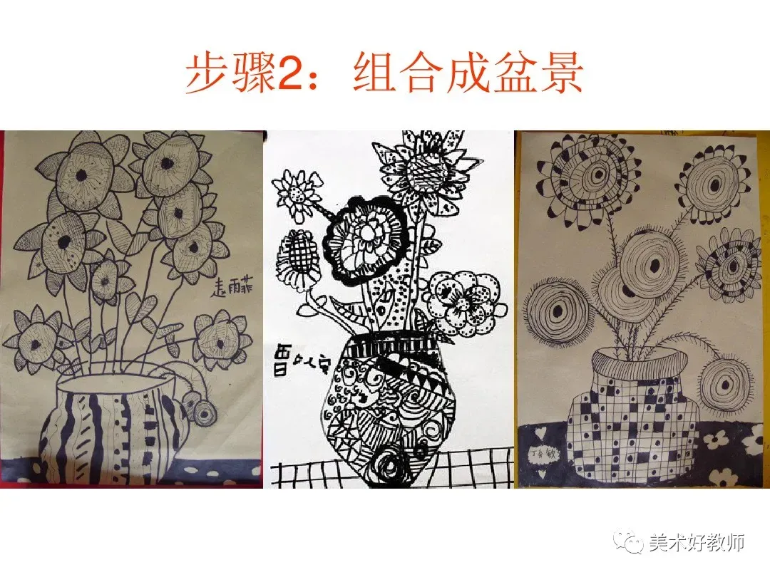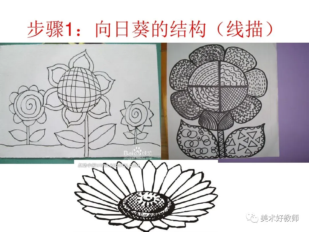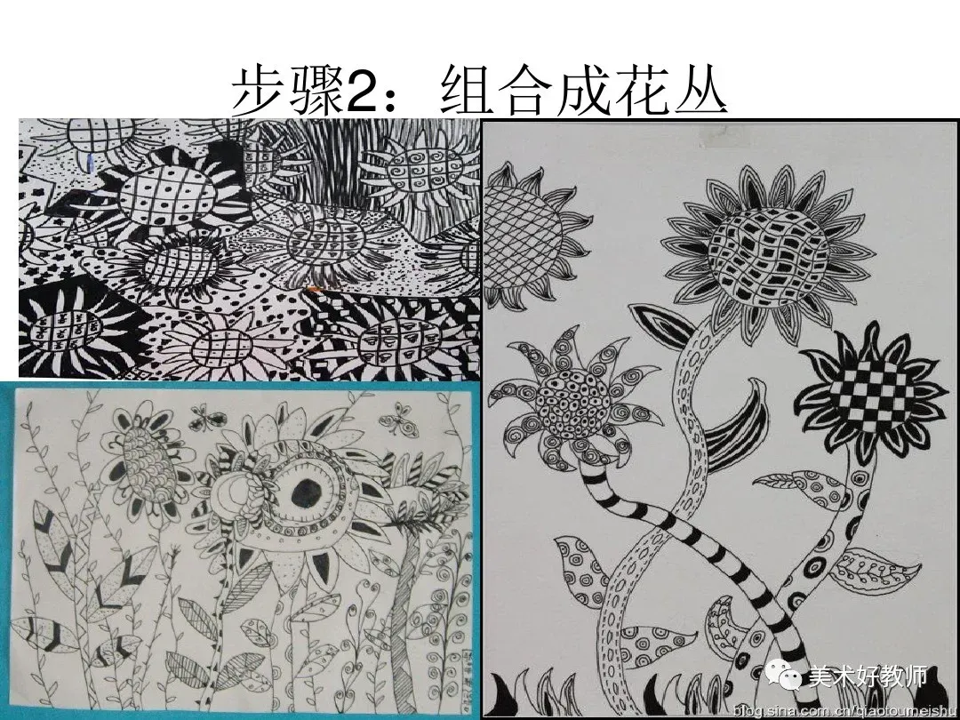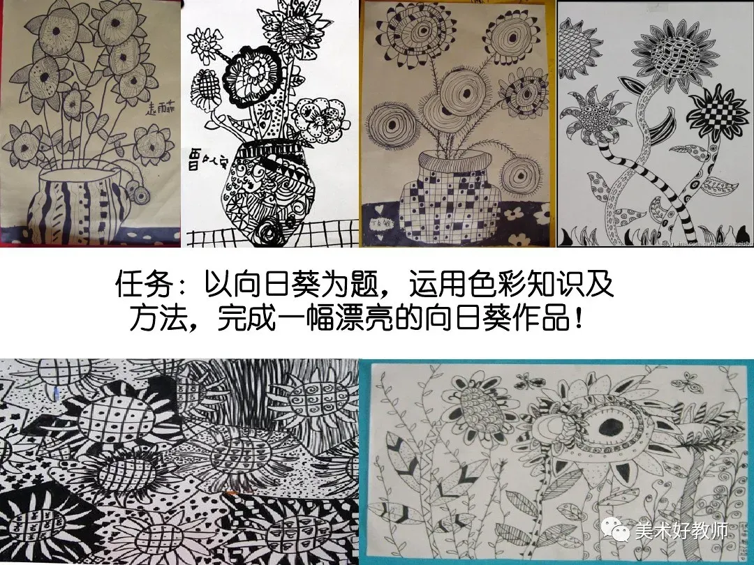 6、我们可以将这幅画分解成许多小色块,近看是些颜色。但远一点或眯眼看,向日葵就清晰地呈现出来了。全班每个同学画其中的一部分,然后组合,可拼成一幅有丰富色彩的《向日葵》。