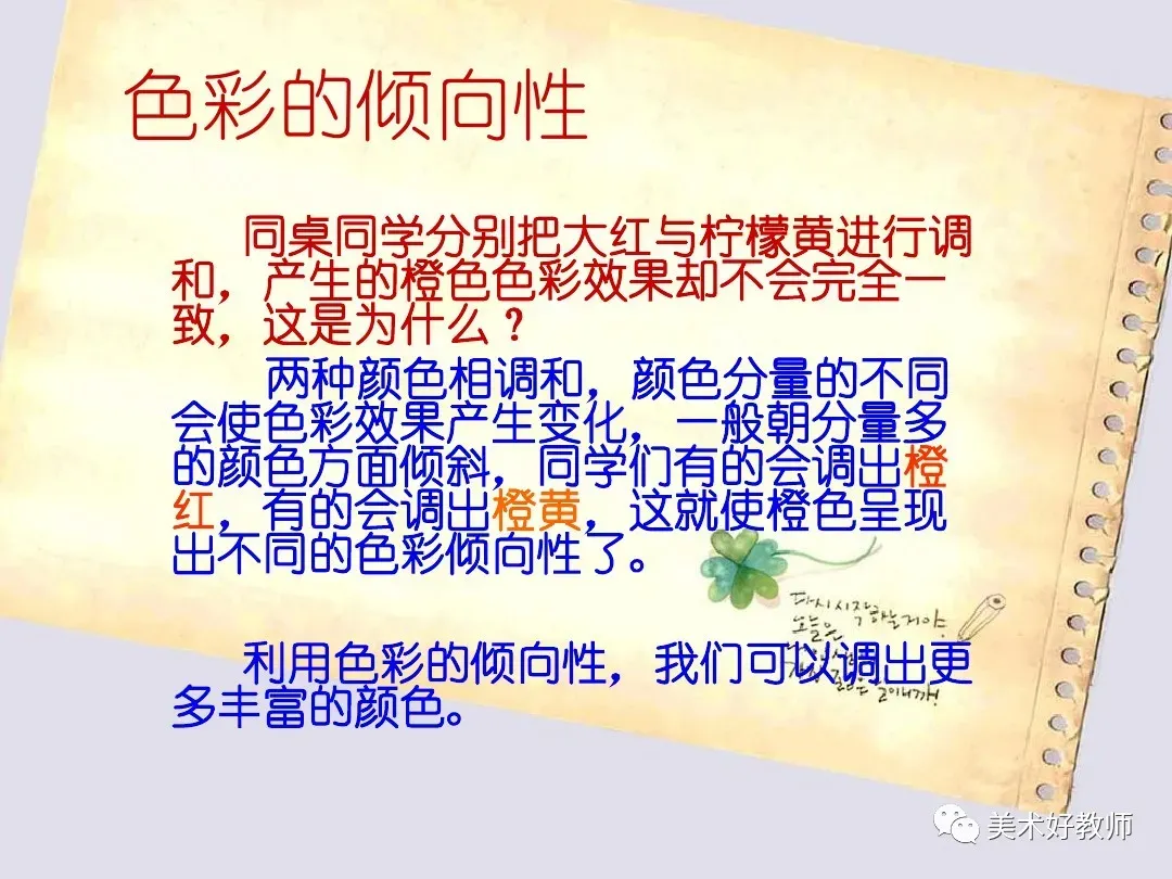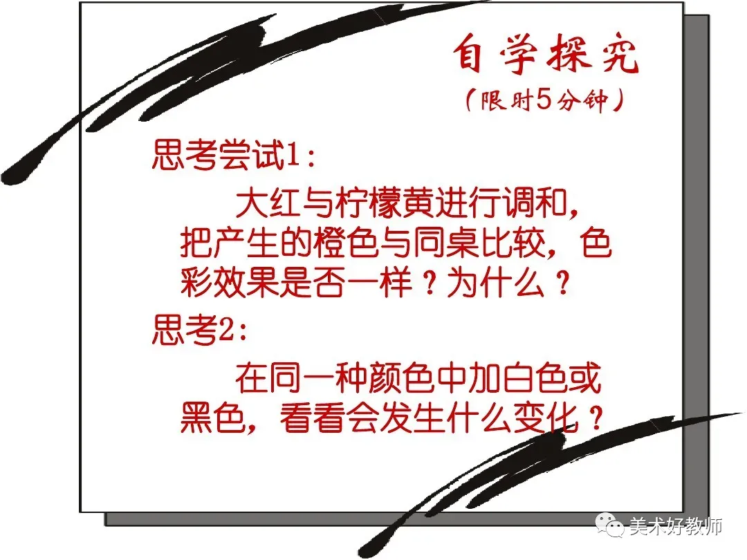 (1)体验 l :根据教材提示,将大红与柠檬黄涂在一起,把产生的橙色与同桌的比一比,色彩效果是否一样 ? 为什么 ?