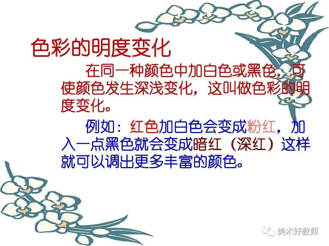 分量多的颜色方面倾斜,所以调色时应先看准色彩的倾向性。(2)体验 2 :在一种颜色中调入白色或黑色,看看会发生什么变化 ? 小结:通过这一方法可使色彩发生深浅变化,这又叫做色彩的
