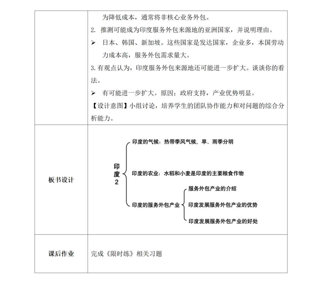 针对气候与农业、服务外包产业两大核心内容,设计不同侧重点的小组探究活动,从基础的分布特点分析,到深层的成因探究、趋势推测,探究难度层层提升,贴合初中学生的地理思维发展水平,让不同层次的学生都能参与其中,提升课堂参与度。