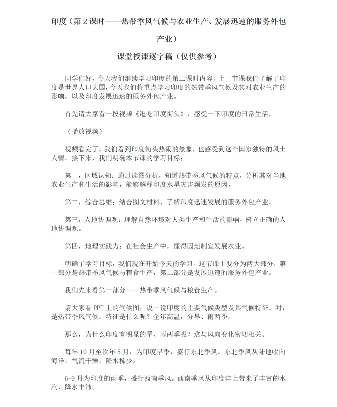 本节课将热带季风气候、地形等自然地理要素,与农业生产、服务外包产业等人文地理内容深度结合,层层递进引导学生探究自然环境对人类生产生活的影响,让学生建立 “自然环境 — 人类活动” 的地理逻辑链,形成系统的区域地理认知。