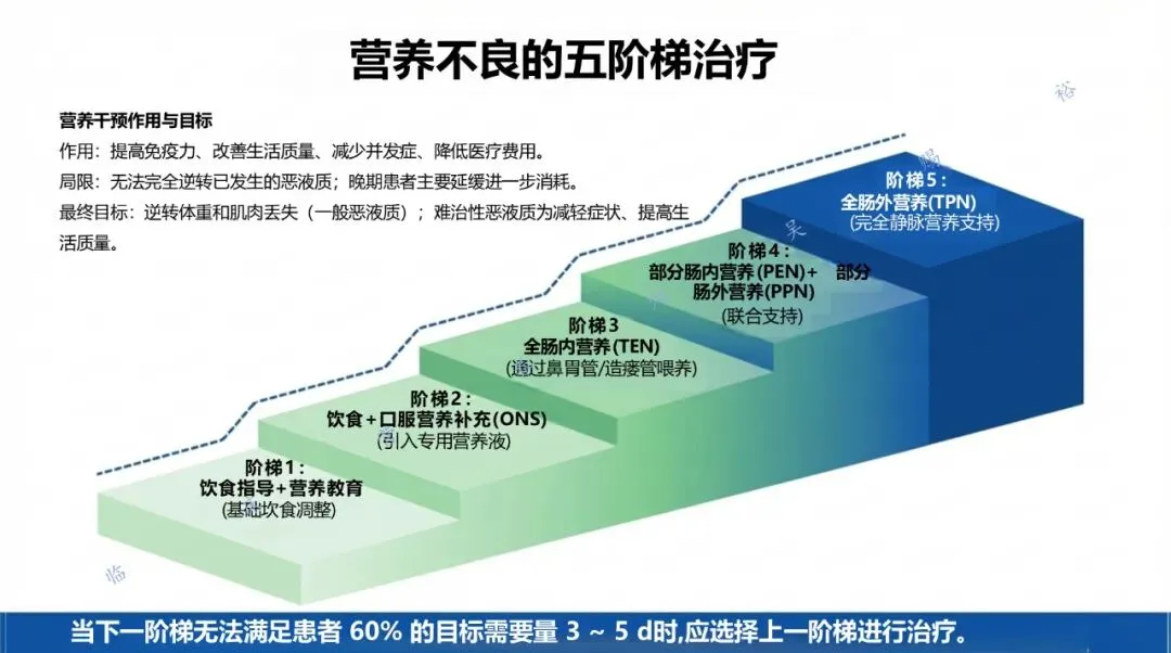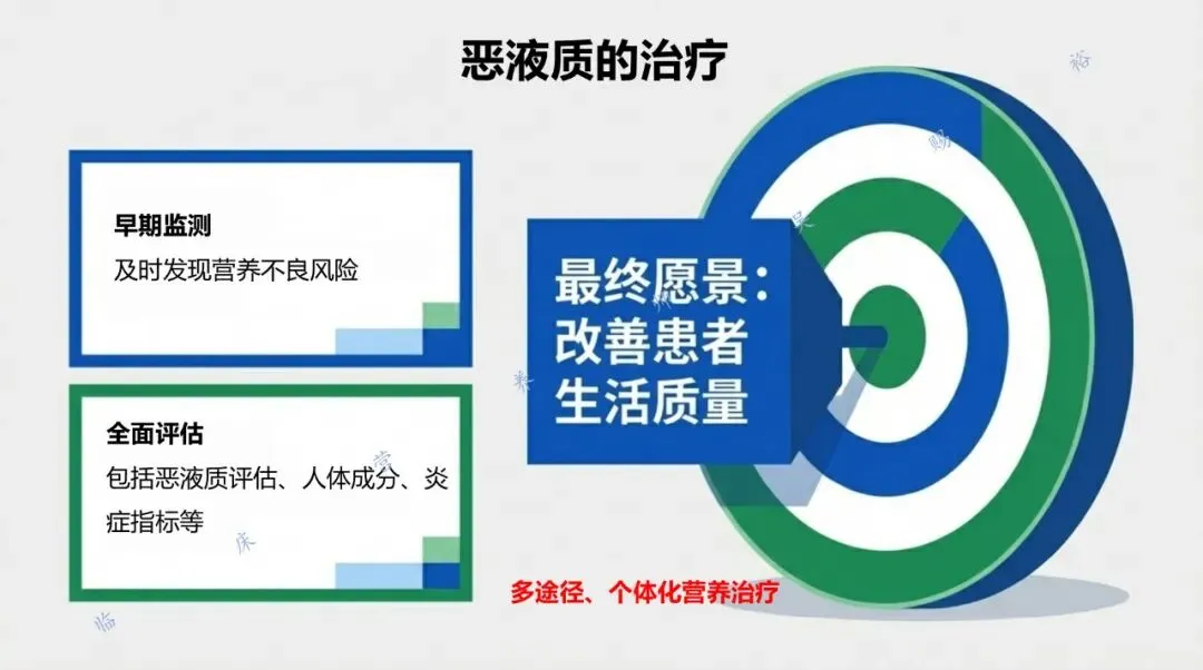 恶液质营养治疗的最终目标是逆转体重丢失和肌肉丢失;对难治性恶液质主要是减轻患者恶液质相关症状,提高 QoL。