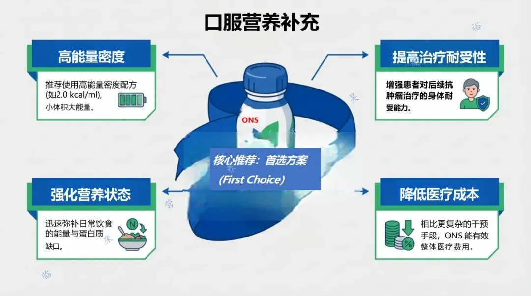 但当强化营养咨询改善经口进食仍无法满足机体的营养需求时,建议应用 ONS 来加强营养补充。
