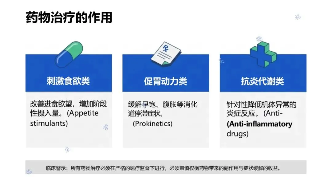 药物治疗可减少厌食,削弱全身性炎症,减少骨骼肌肉分解代谢或刺激肌肉蛋白合成代谢,可能会减缓消耗的进程。