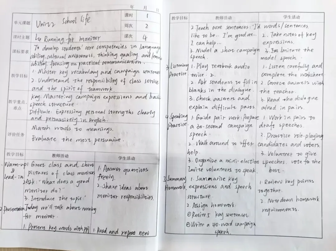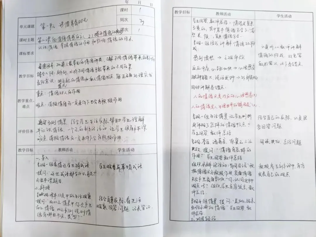 在教案检查中,教务处对各学科教师备课情况进行了细致查阅。整体来看,全体教师均能按教学进度规范完成备课,教案结构完整、环节齐全,能够紧扣课标要求与学生实际,精准设定教学目标、突出重难点,教学过程设计合理、思路清晰。不少教师注重教学创新,融入互动探究环节,课后反思真实深刻,体现出严谨务实的备课态度。针对个别教案存在的细节不足,检查小组也提出了具体改进意见,助力教师优化备课质量。