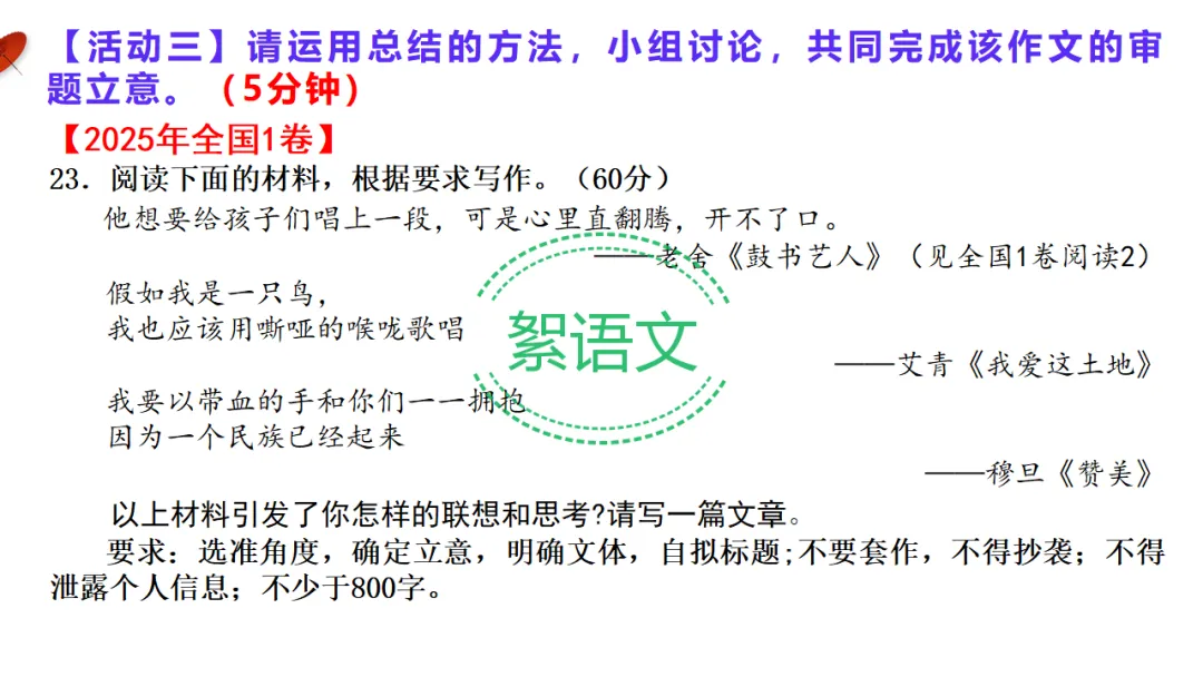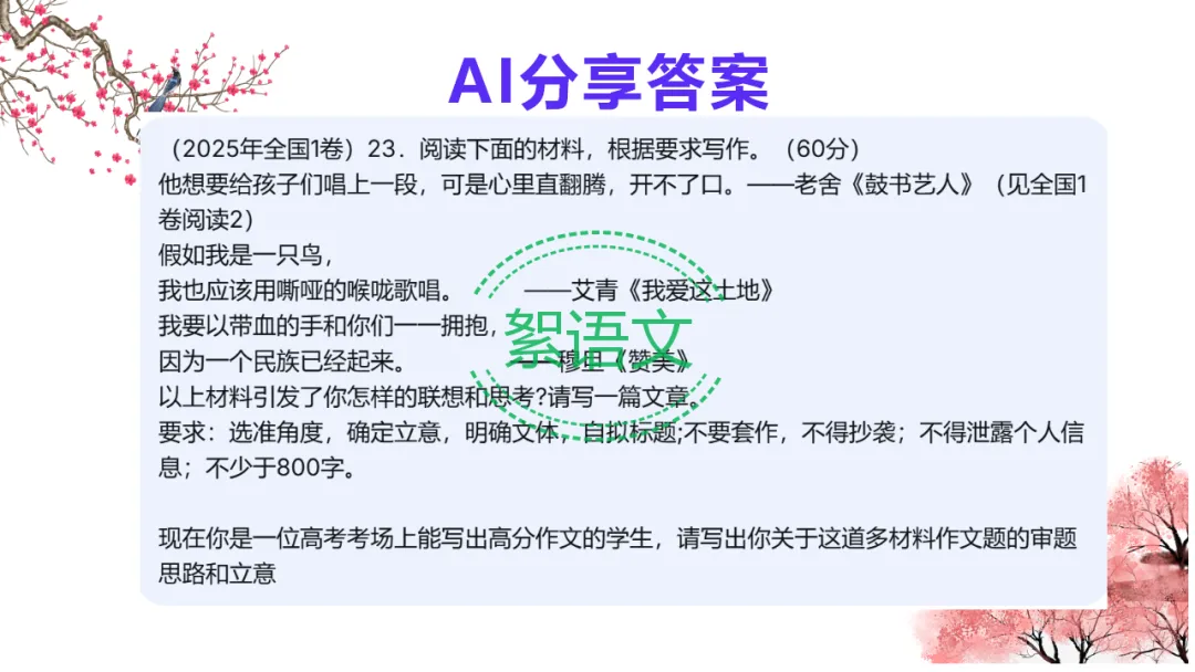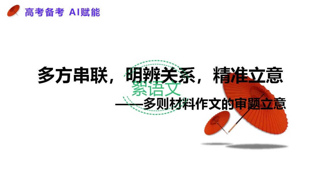 导入语:多则材料作文是高考高频题型,重点考查综合分析能力。本节课借助 AI 赋能,用统一方法快速破题,实现立意又快又准。