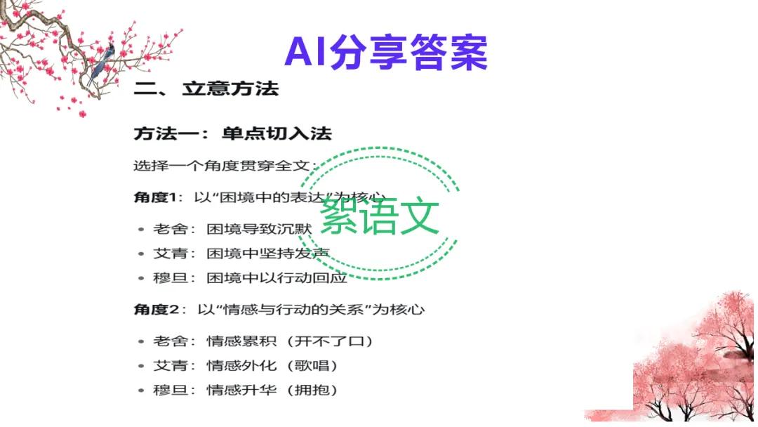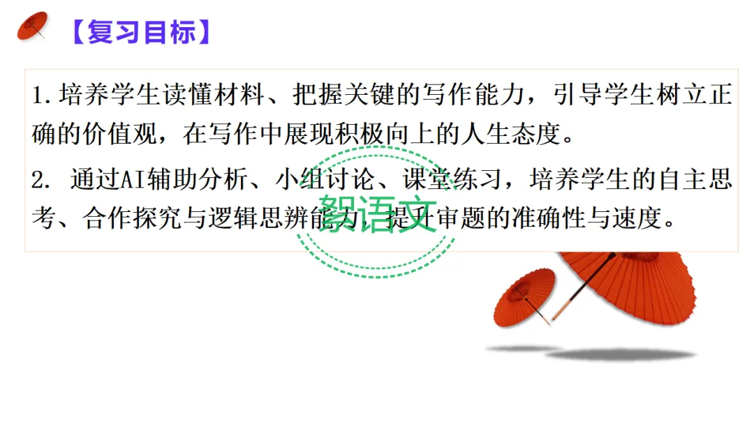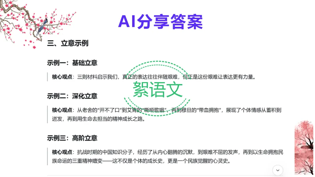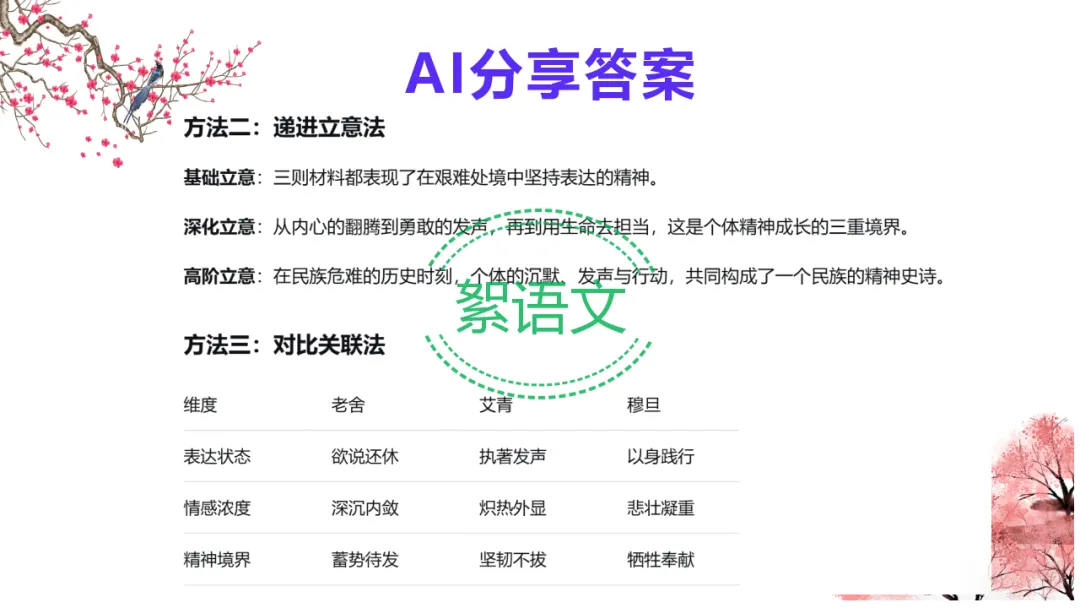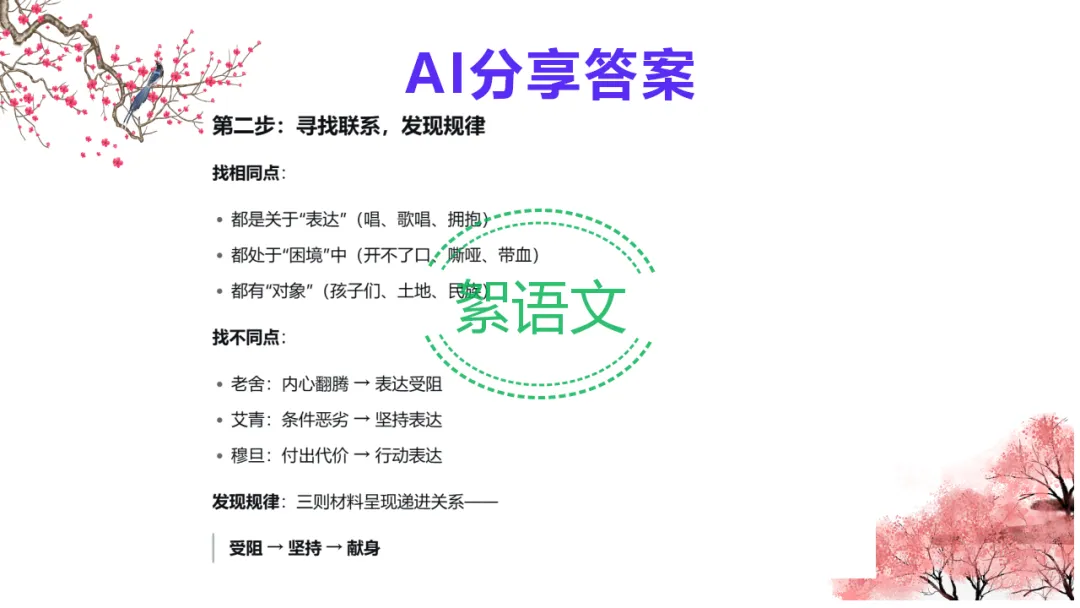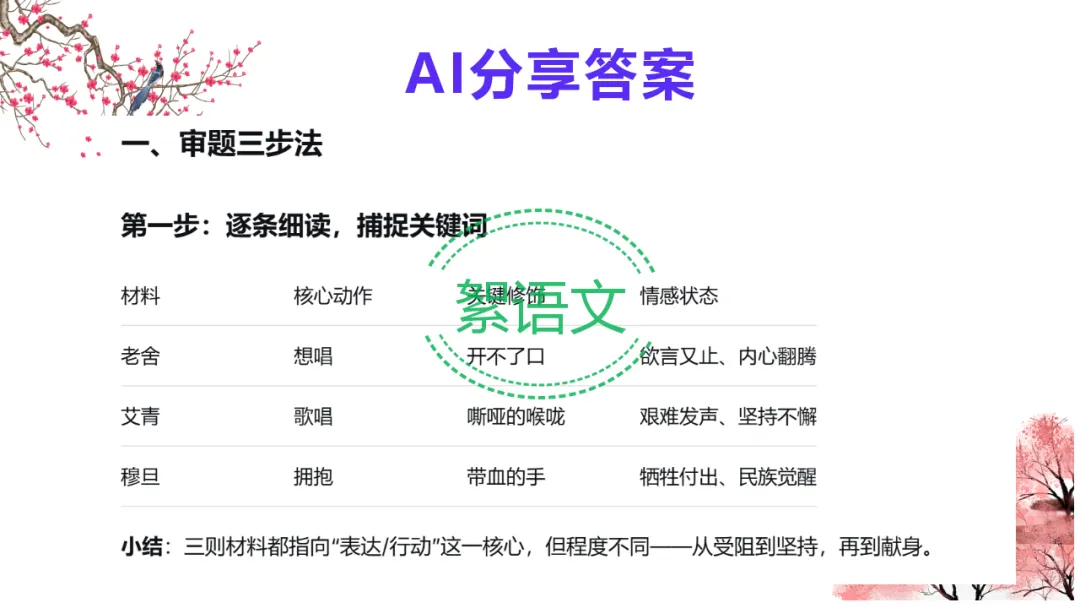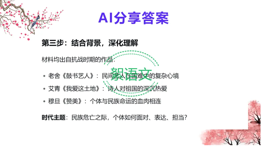2.教师总结:多则材料考分析与综合能力,抓关系、立深意、扣主题,AI 可助力高效提升。